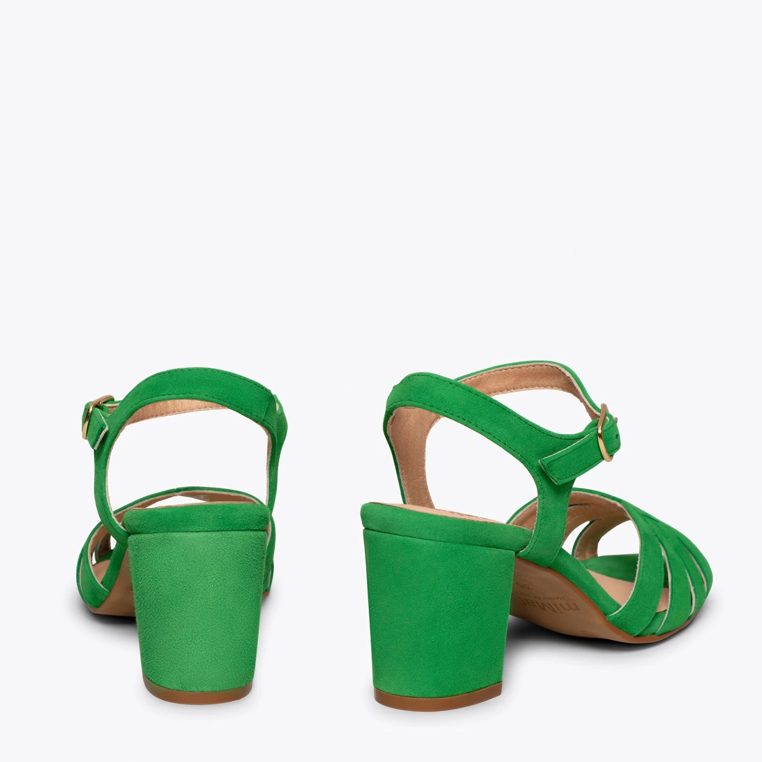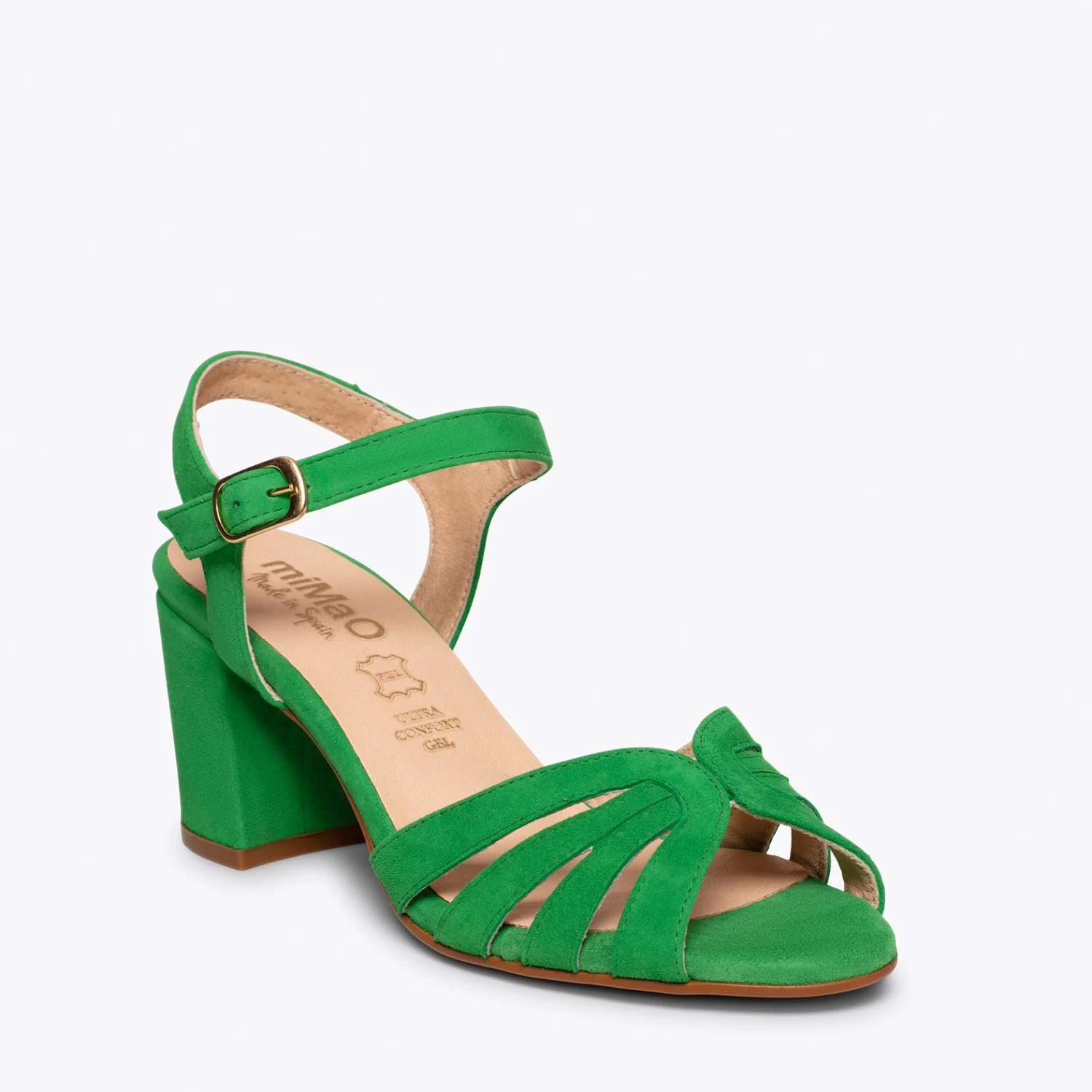 Sandale élégante échancrée à lanières. Une sandale confortable avec un talon de 6,5 cm de large. Sandales en cuir amte VERT que vous pouvez combiner avec vos looks préférés. Un design conçu pour styliser votre pied, avec une élégante fermeture à boucle à la cheville.