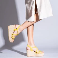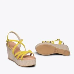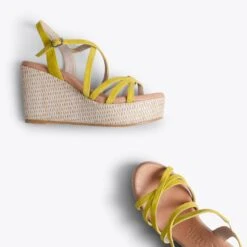 Sandale compensée avec une plateforme JAUNE confortable avec des brides en cuir croisées élégantes et fines qui styliseront votre pied. Une semelle compensée pour femme de 9 cm de hauteur et une plateforme de 4 cm qui, avec la semelle intérieure en cuir rembourré Ultra Confort Gel feront de vos sandales miMaO vos chaussures d’été les plus confortables. Profitez de la qualité d’une sandale en cuir Made in Spain.