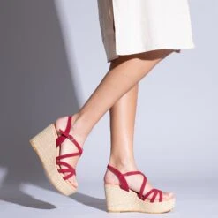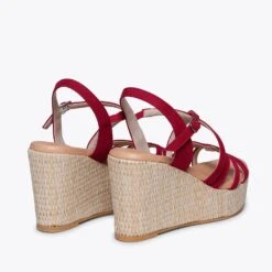 Sandale compensée avec une plateforme ROUGE confortable avec des brides en cuir croisées élégantes et fines qui styliseront votre pied. Une semelle compensée pour femme de 9 cm de hauteur et une plateforme de 4 cm qui, avec la semelle intérieure en cuir rembourré Ultra Confort Gel feront de vos sandales miMaO vos chaussures d’été les plus confortables. Profitez de la qualité d’une sandale en cuir Made in Spain.