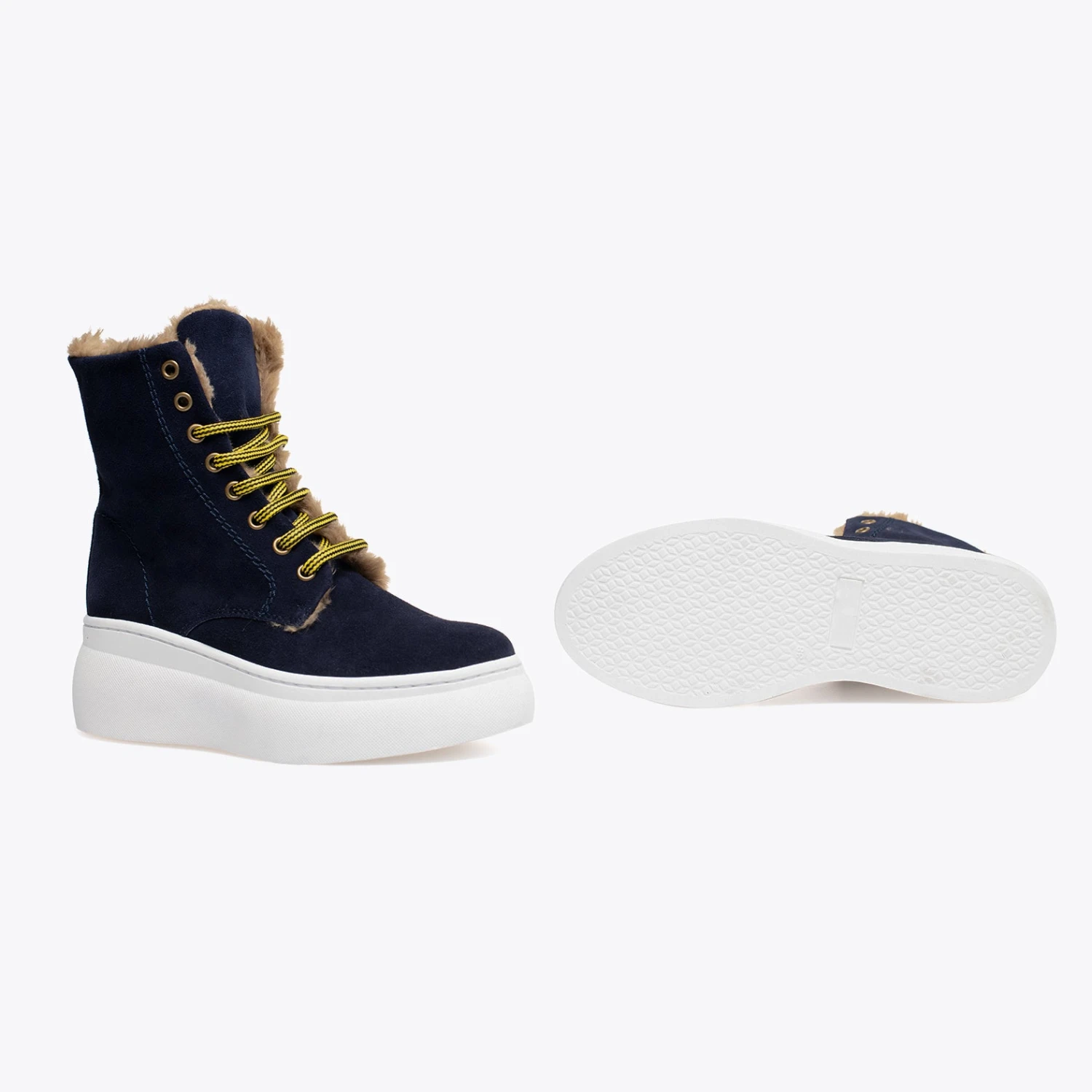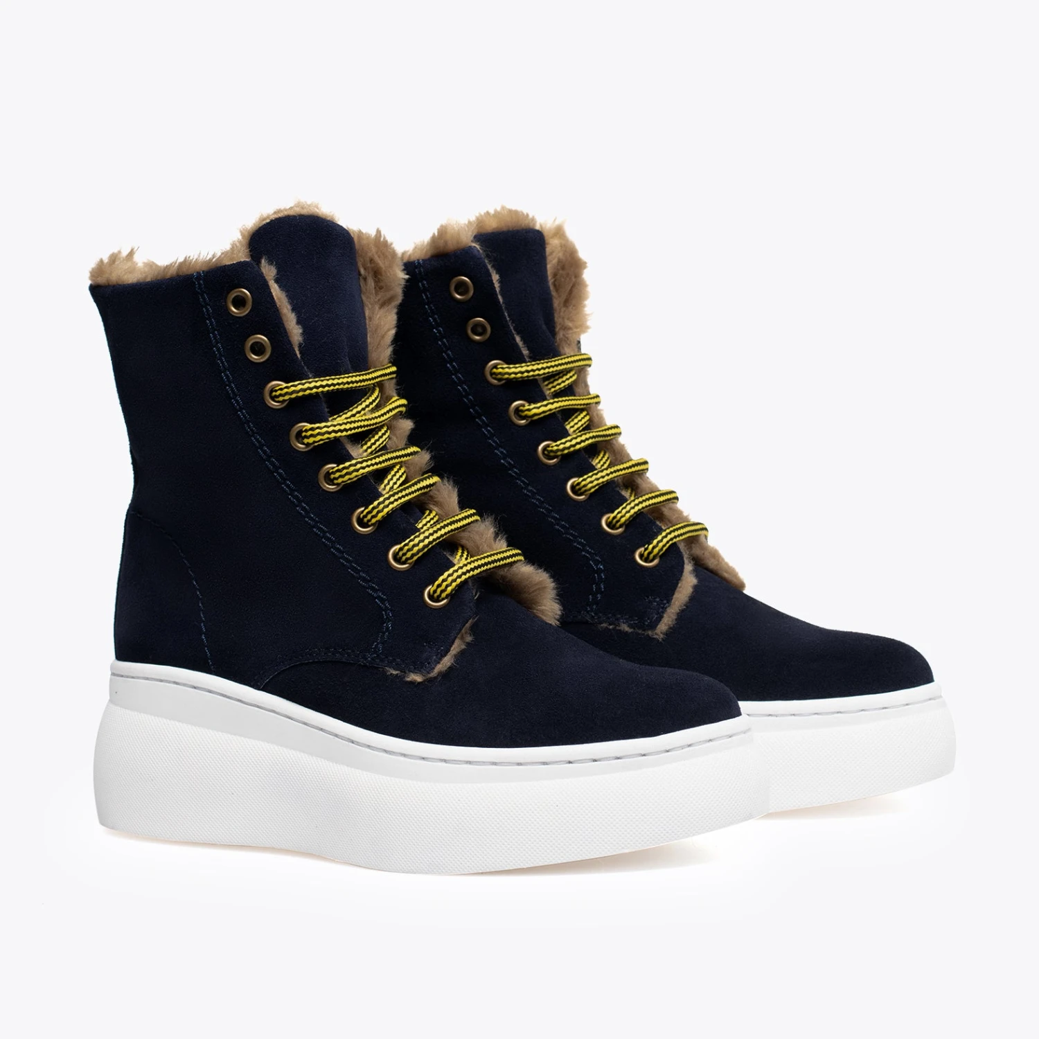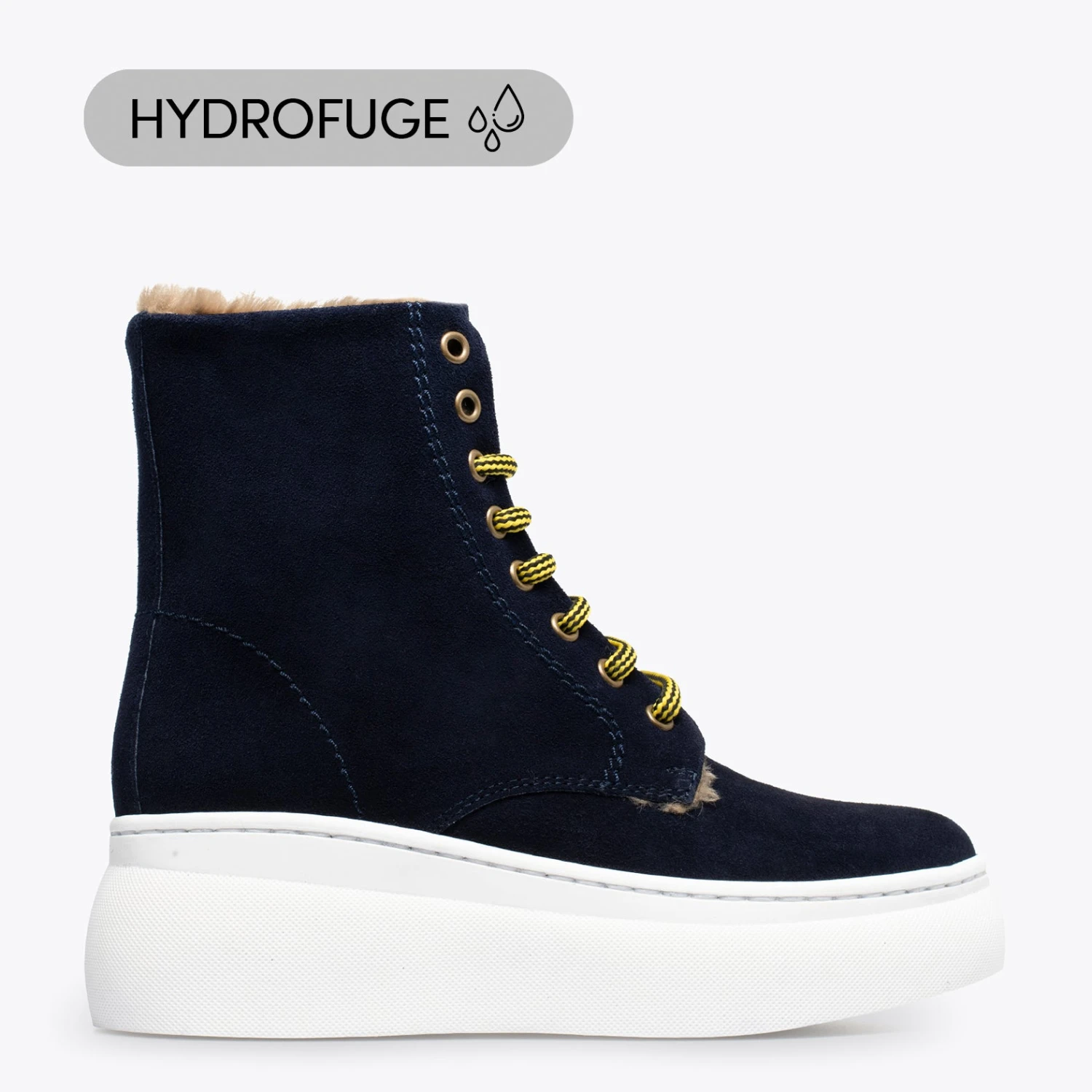 Bottes imperméables hydrofuges BLEU MARINE pour femme à plateforme blanche et à lacets bicolores. Bottes pour femme à plateforme BLEU MARINE confortables. La plateforme arrière mesure 5 cm et la partie à l’avant mesure 3 cm de hauteur, avec une semelle extérieur en caoutchouc antidérapante. En plus, ajoutez un confort supplémentaire à chacun de vos pas grâce à la technologie de la semelle intérieure Memory Absorber Foam amovible.