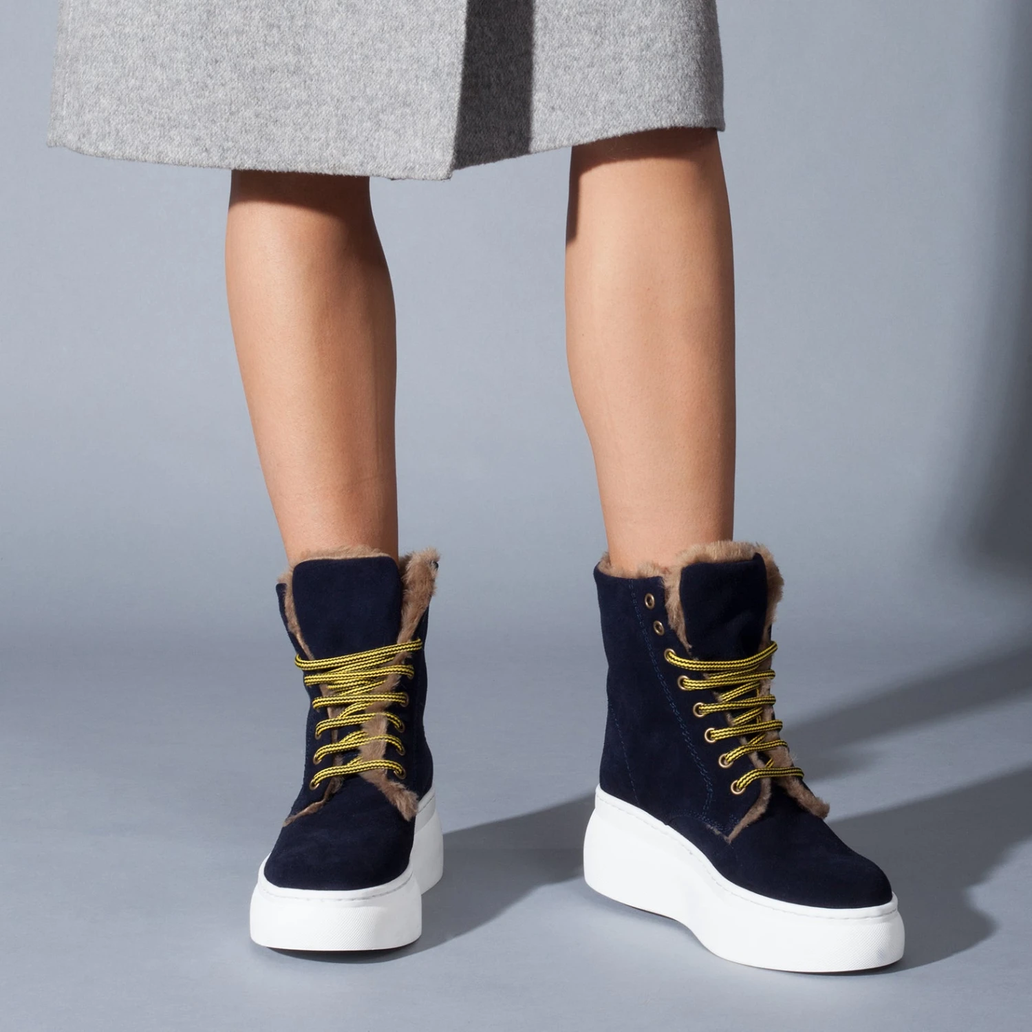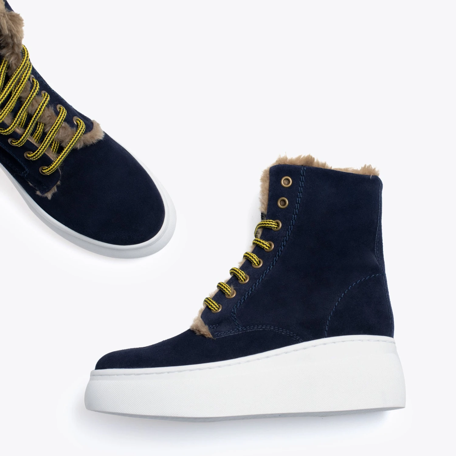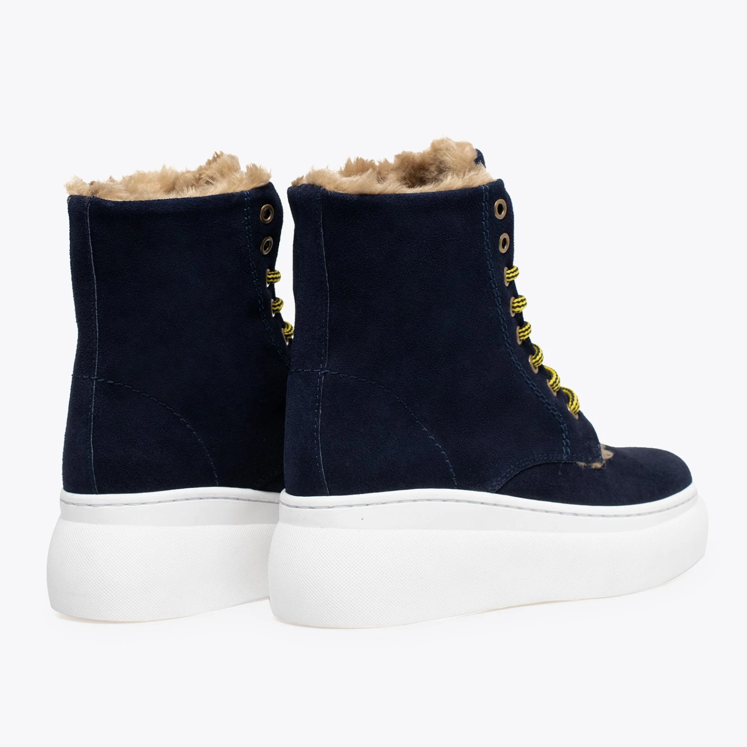 Bottes imperméables hydrofuges BLEU MARINE pour femme à plateforme blanche et à lacets bicolores. Bottes pour femme à plateforme BLEU MARINE confortables. La plateforme arrière mesure 5 cm et la partie à l’avant mesure 3 cm de hauteur, avec une semelle extérieur en caoutchouc antidérapante. En plus, ajoutez un confort supplémentaire à chacun de vos pas grâce à la technologie de la semelle intérieure Memory Absorber Foam amovible.