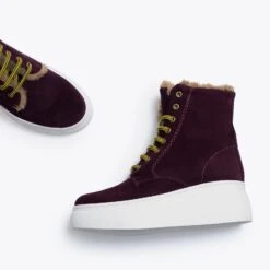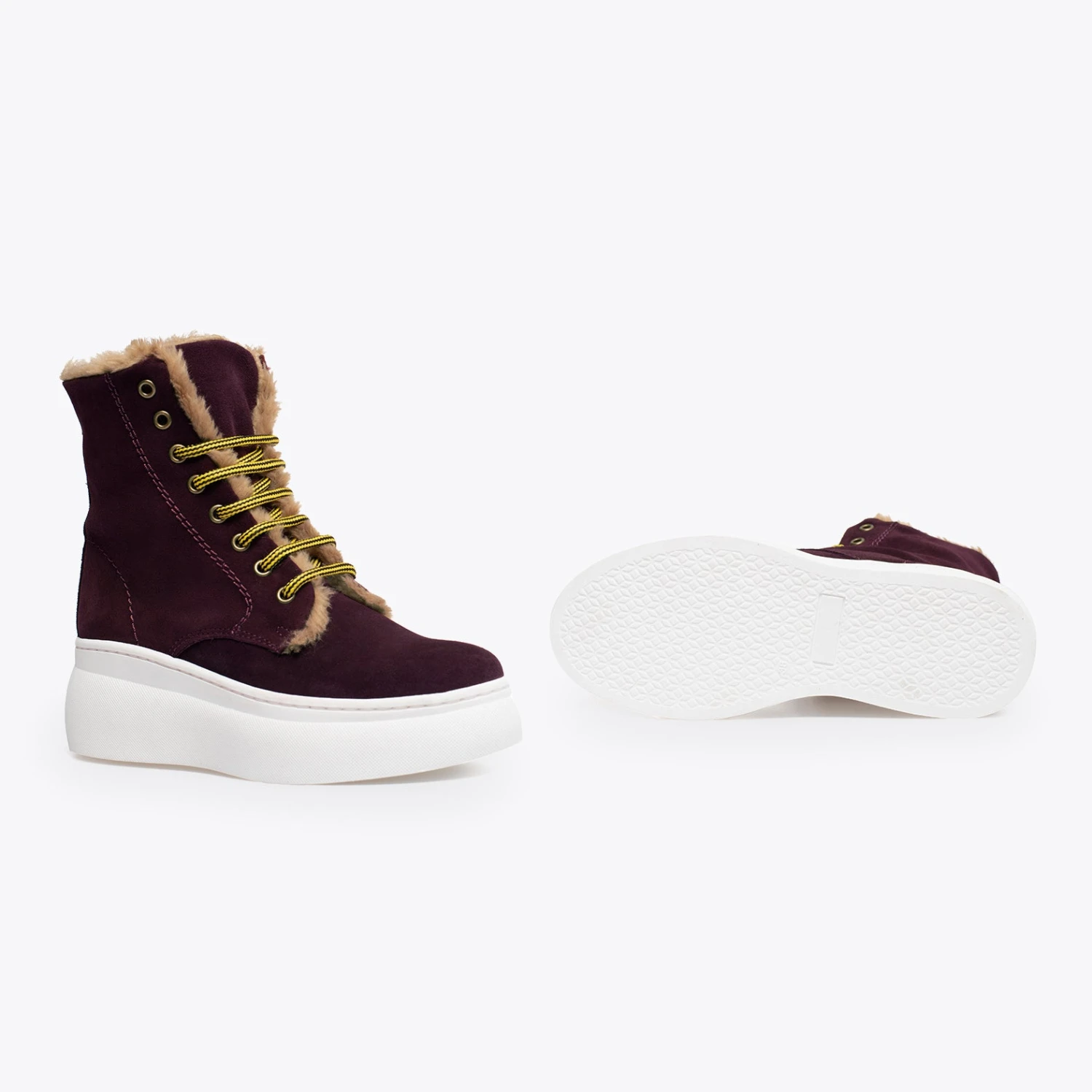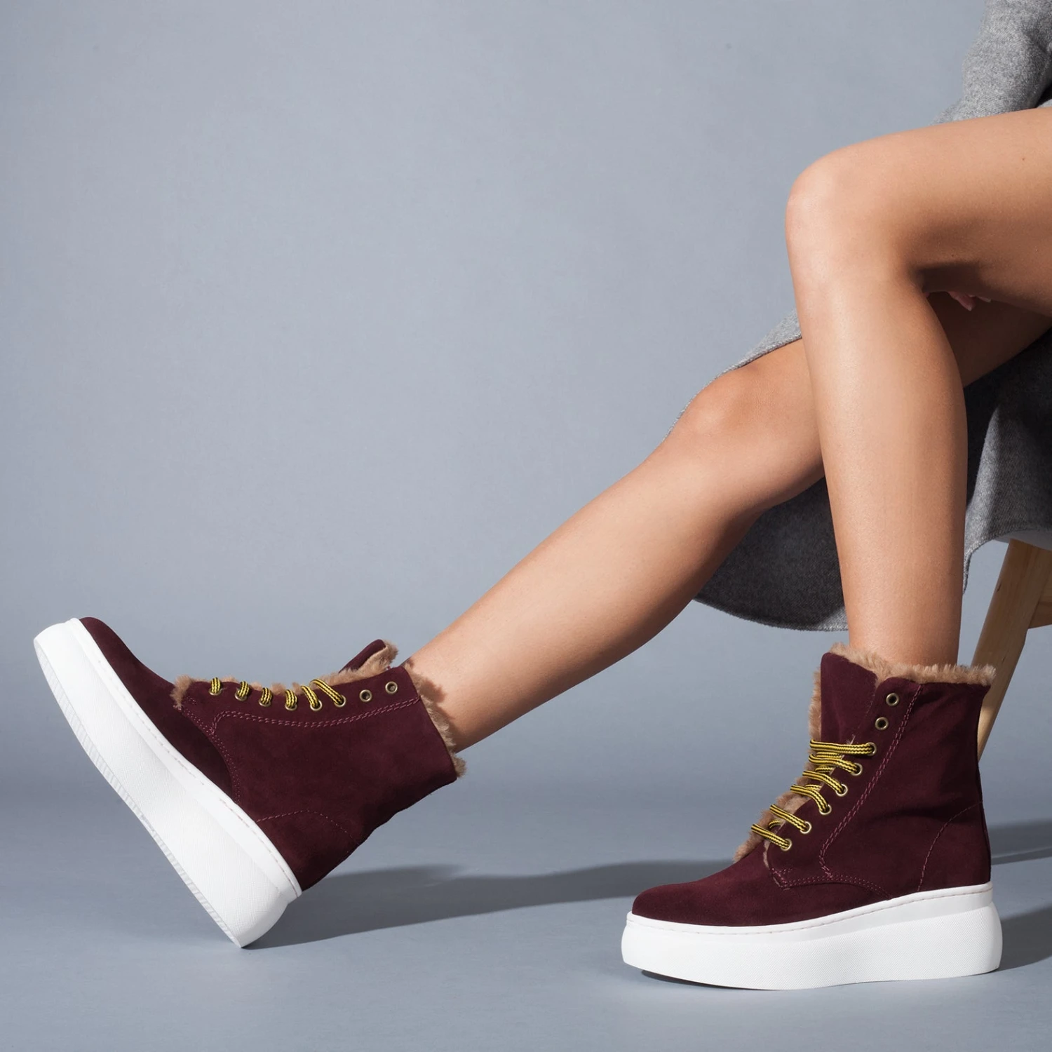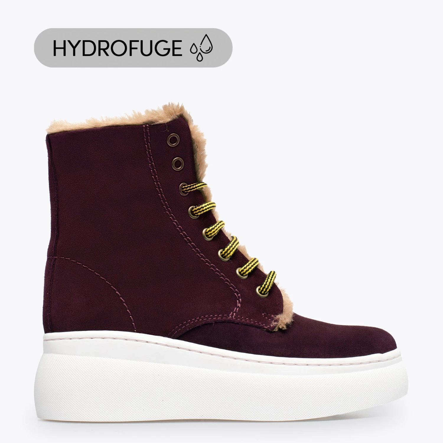 Bottes imperméables hydrofuges BORDEAUX pour femme à plateforme blanche et à lacets bicolores. Bottes pour femme à plateforme BORDEAUX confortables. La plateforme arrière mesure 5 cm et la partie à l’avant mesure 3 cm de hauteur, avec une semelle extérieur en caoutchouc antidérapante. En plus, ajoutez un confort supplémentaire à chacun de vos pas grâce à la technologie de la semelle intérieure Memory Absorber Foam amovible.