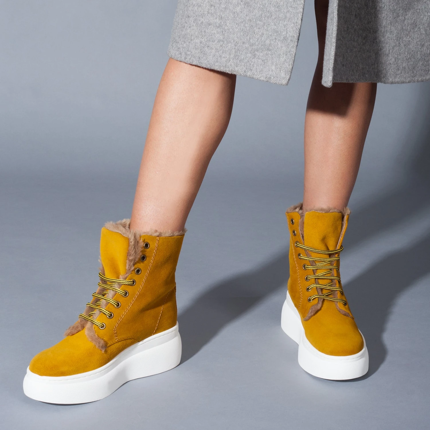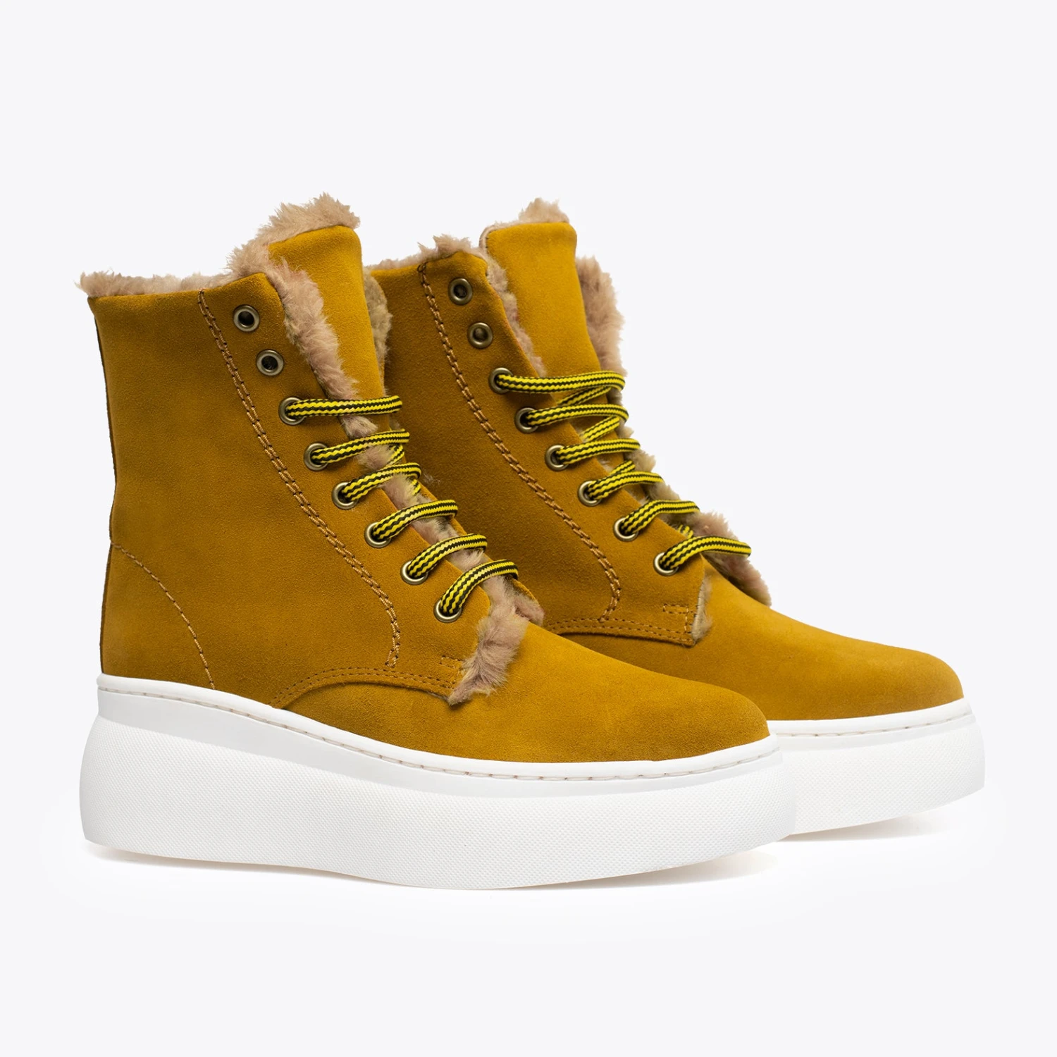 Bottes imperméables hydrofuges MOUTARDE pour femme à plateforme blanche et à lacets bicolores. Bottes pour femme à plateforme MOUTARDE confortables. La plateforme arrière mesure 5 cm et la partie à l’avant mesure 3 cm de hauteur, avec une semelle extérieur en caoutchouc antidérapante. En plus, ajoutez un confort supplémentaire à chacun de vos pas grâce à la technologie de la semelle intérieure Memory Absorber Foam amovible.