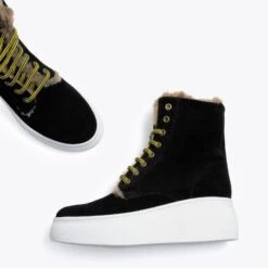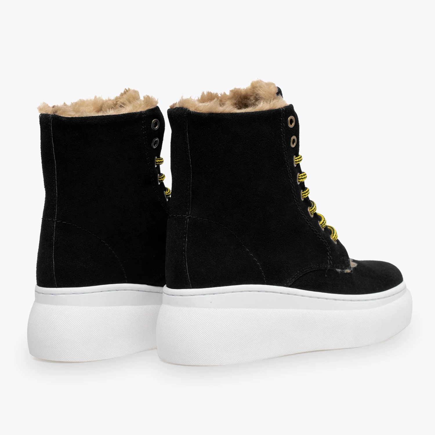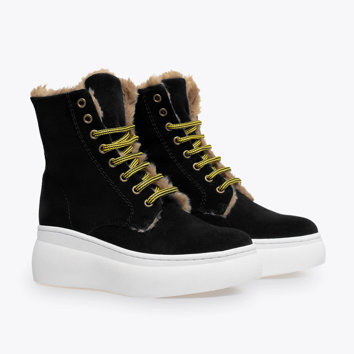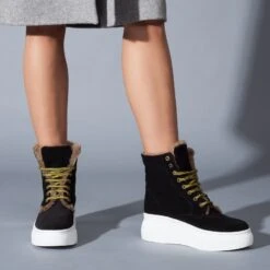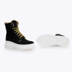 Bottes imperméables hydrofuges NOIR pour femme à plateforme blanche et à lacets bicolores. Bottes pour femme à plateforme NOIR confortables. La plateforme arrière mesure 5 cm et la partie à l’avant mesure 3 cm de hauteur, avec une semelle extérieur en caoutchouc antidérapante. En plus, ajoutez un confort supplémentaire à chacun de vos pas grâce à la technologie de la semelle intérieure Memory Absorber Foam amovible.