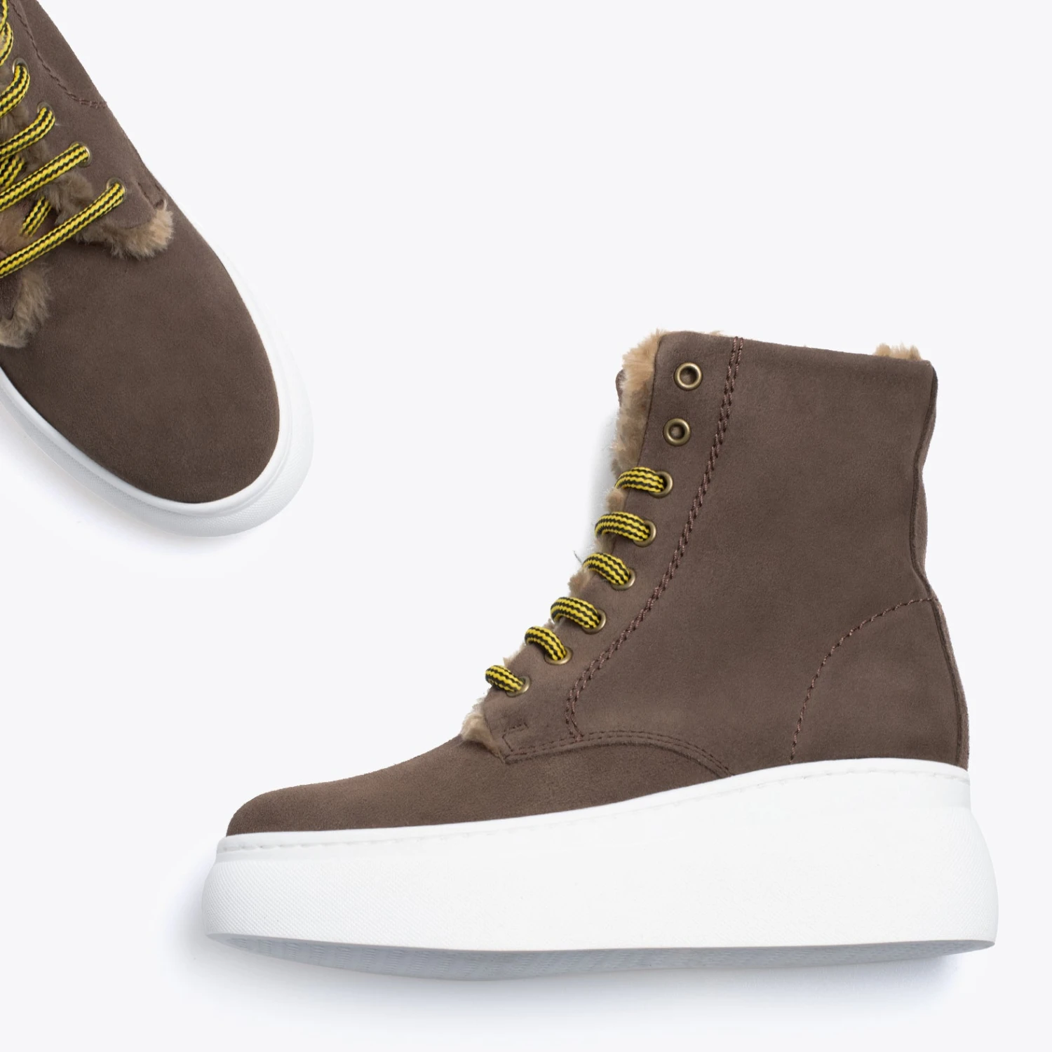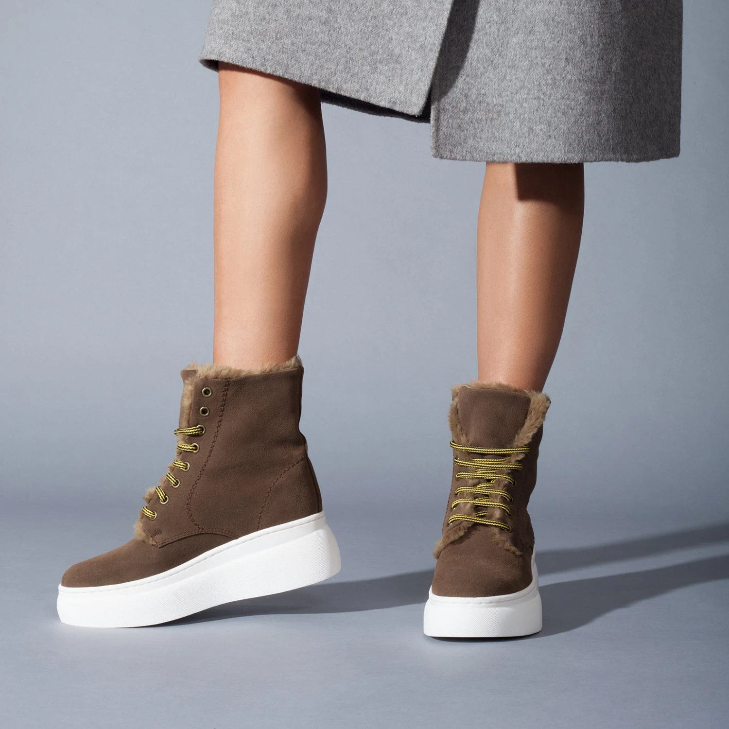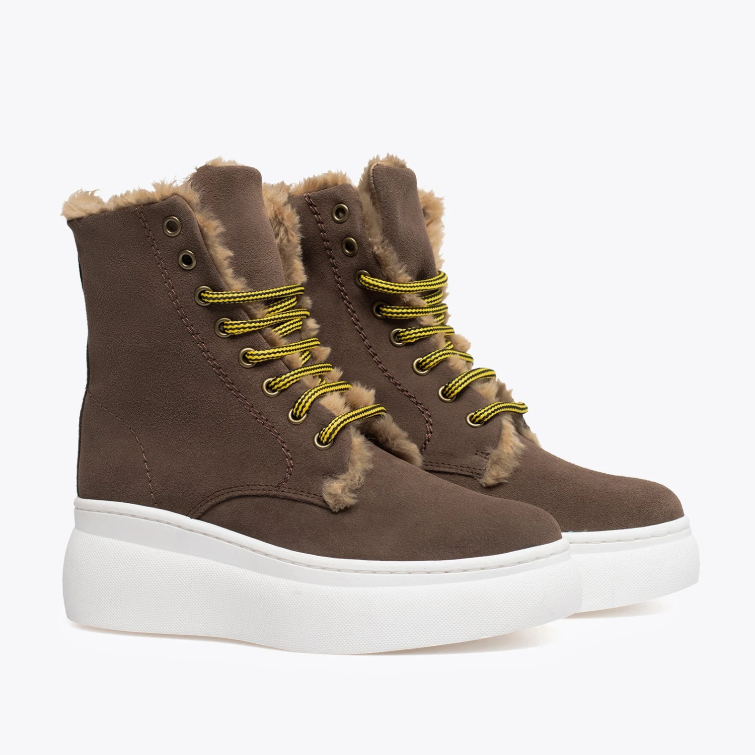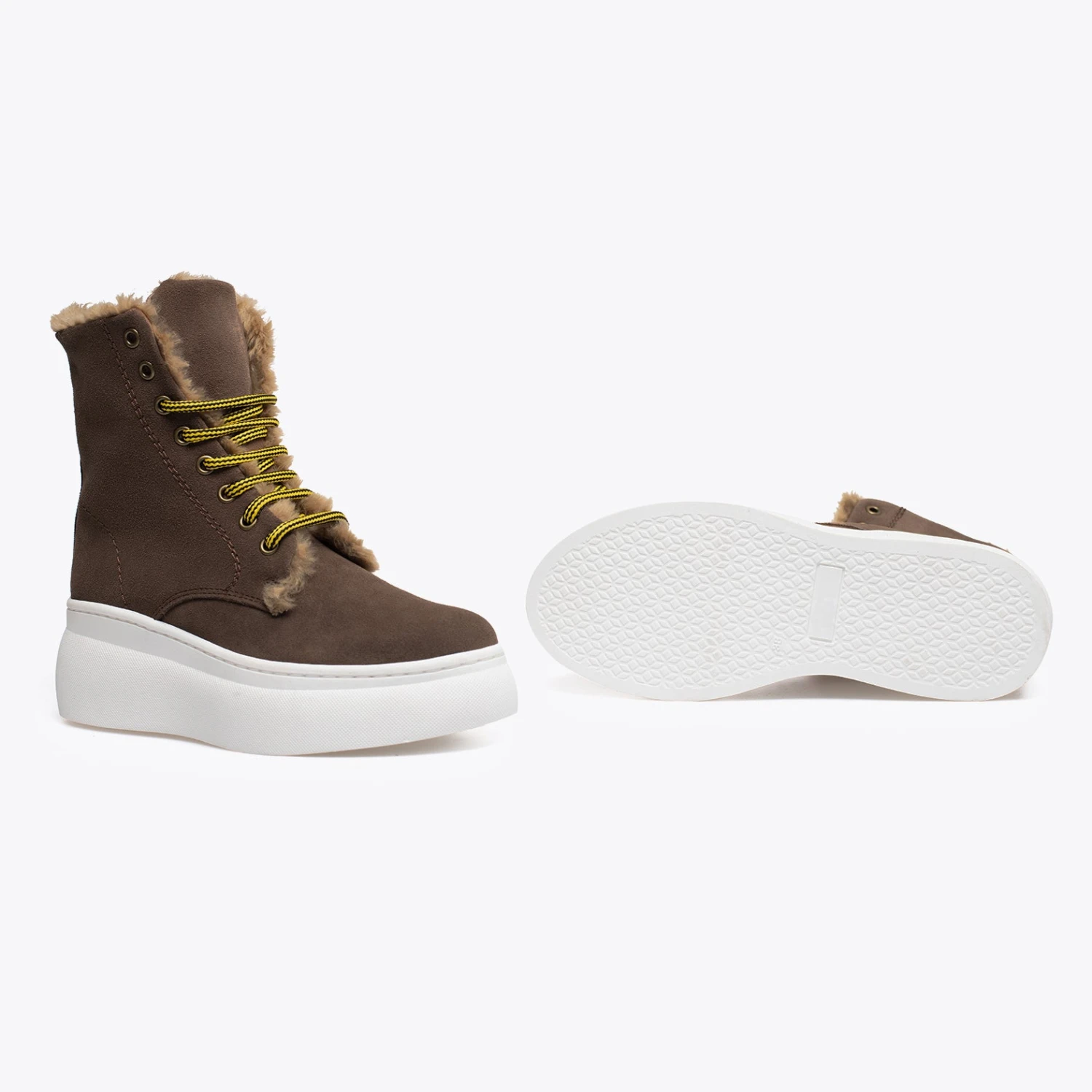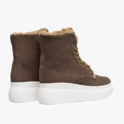 Bottes imperméables hydrofuges TAUPE pour femme à plateforme blanche et à lacets bicolores. Bottes pour femme à plateforme TAUPE confortables. La plateforme arrière mesure 5 cm et la partie à l’avant mesure 3 cm de hauteur, avec une semelle extérieur en caoutchouc antidérapante. En plus, ajoutez un confort supplémentaire à chacun de vos pas grâce à la technologie de la semelle intérieure Memory Absorber Foam amovible.