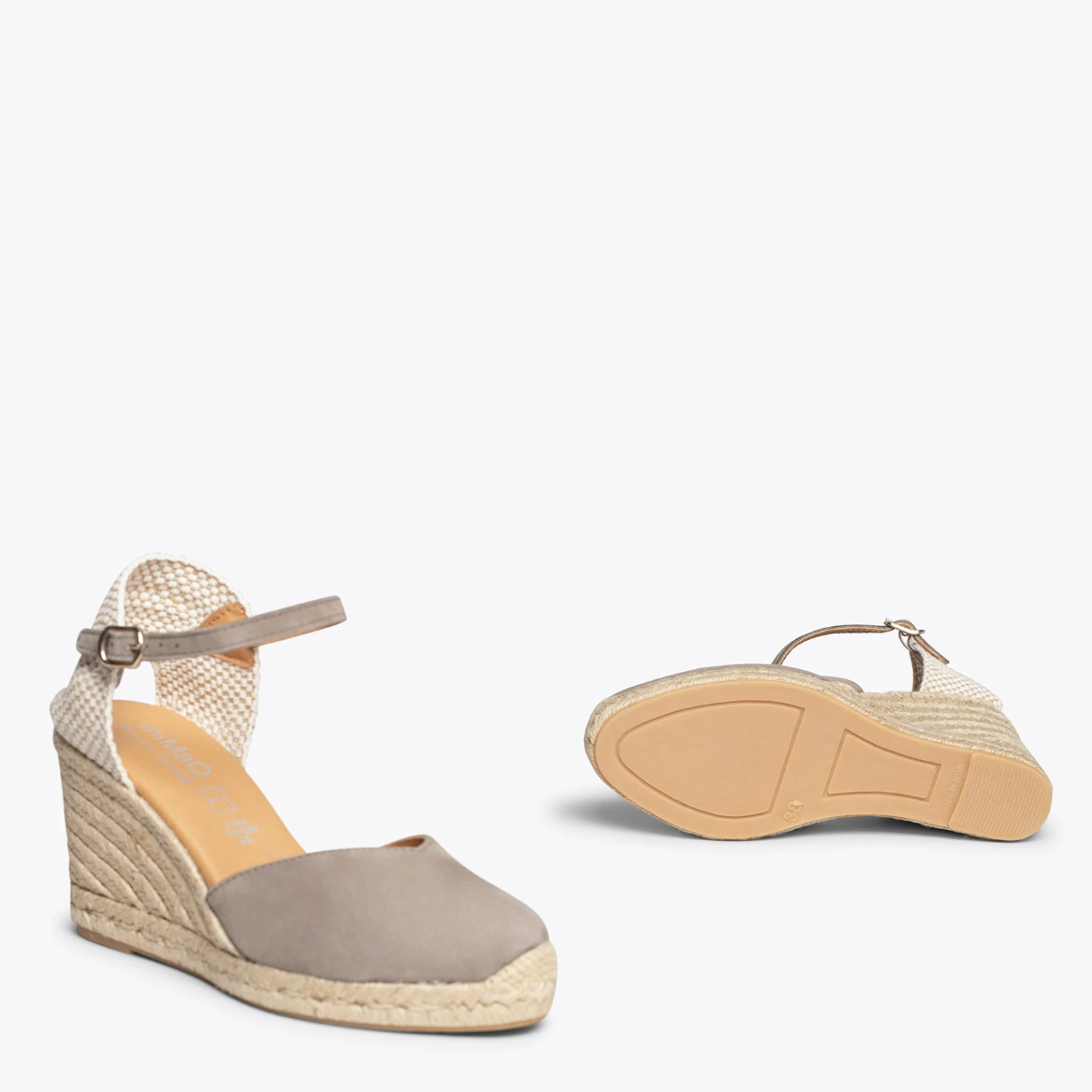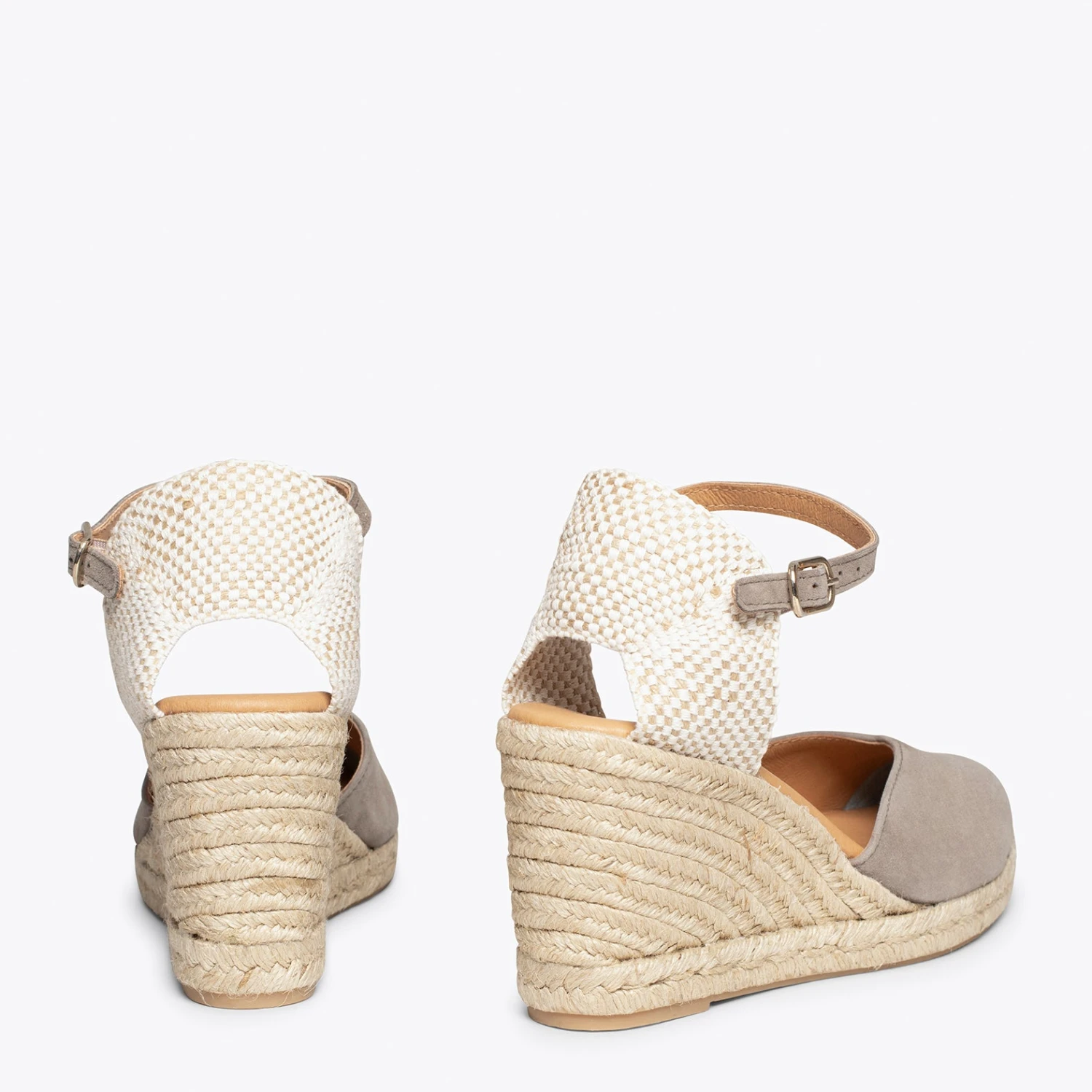 Sandale espadrille avec design élégant, échancrure en V sophistiquée et une bride également en daim GRIS et un talon ouvert en toile. Sans aucun doute, des espadrilles en jute élégantes à porter cet été avec vos looks préférés.