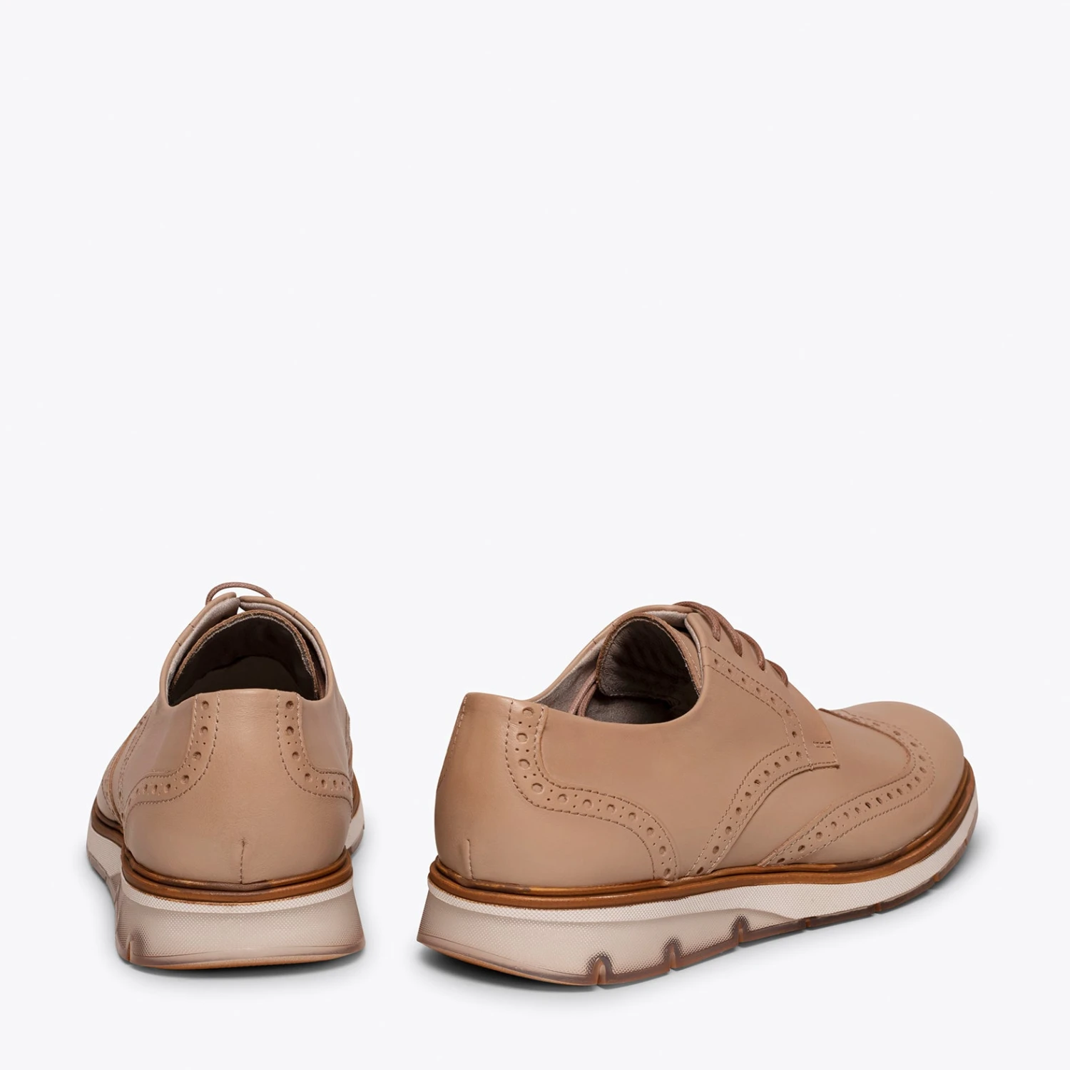 Chaussures à lacets pour hommes TAUPE avec coupe anglaise. Chaussures Oxford en cuir Nappa du printemps été 2021. Ces chaussures pour homme intègrent la semelle intérieure amovible en cuir Memory Absorber Foam, qui donnera un confort supplémentaire à chacun de vos pas. De plus, ces chaussures pour homme de style Oxford ont une grosse semelle en caoutchouc de sport, qui donnera une touche décontractée à vos looks.