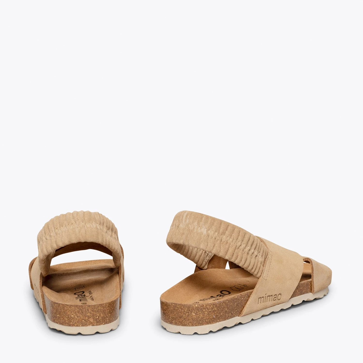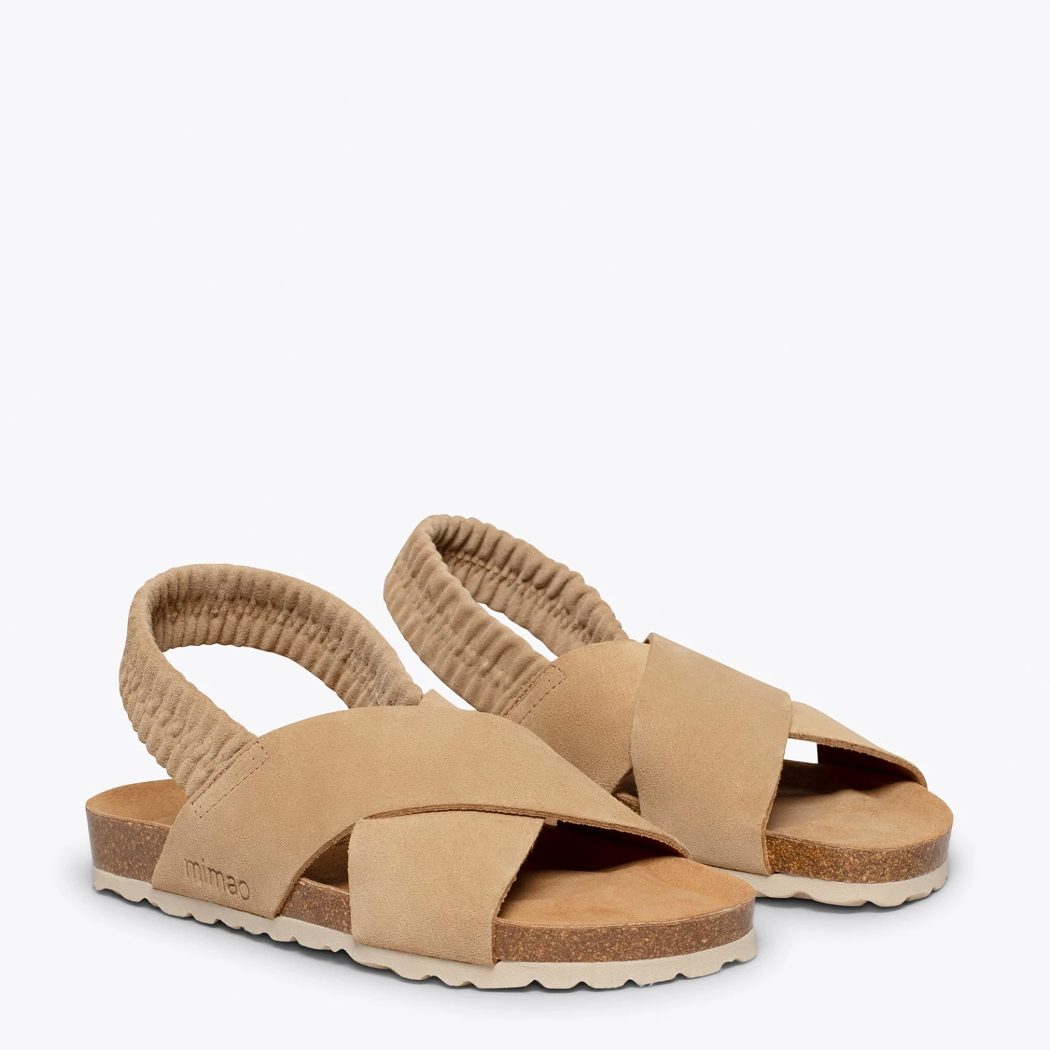 Sandales bio pour femme BEIGE avec semelle extérieure de 2 cm, brides croisées et à la cheville. Sandale confortable BEIGE en cuir nubuck avec semelle extérieure ultra-flexible et semelle intérieure confort gel en cuir. Essayez la qualité de ces chaussures faites en Espagne. Commandez vos chaussures confortables en ligne et recevez-les sous 2 a 4 jours ouvrables.