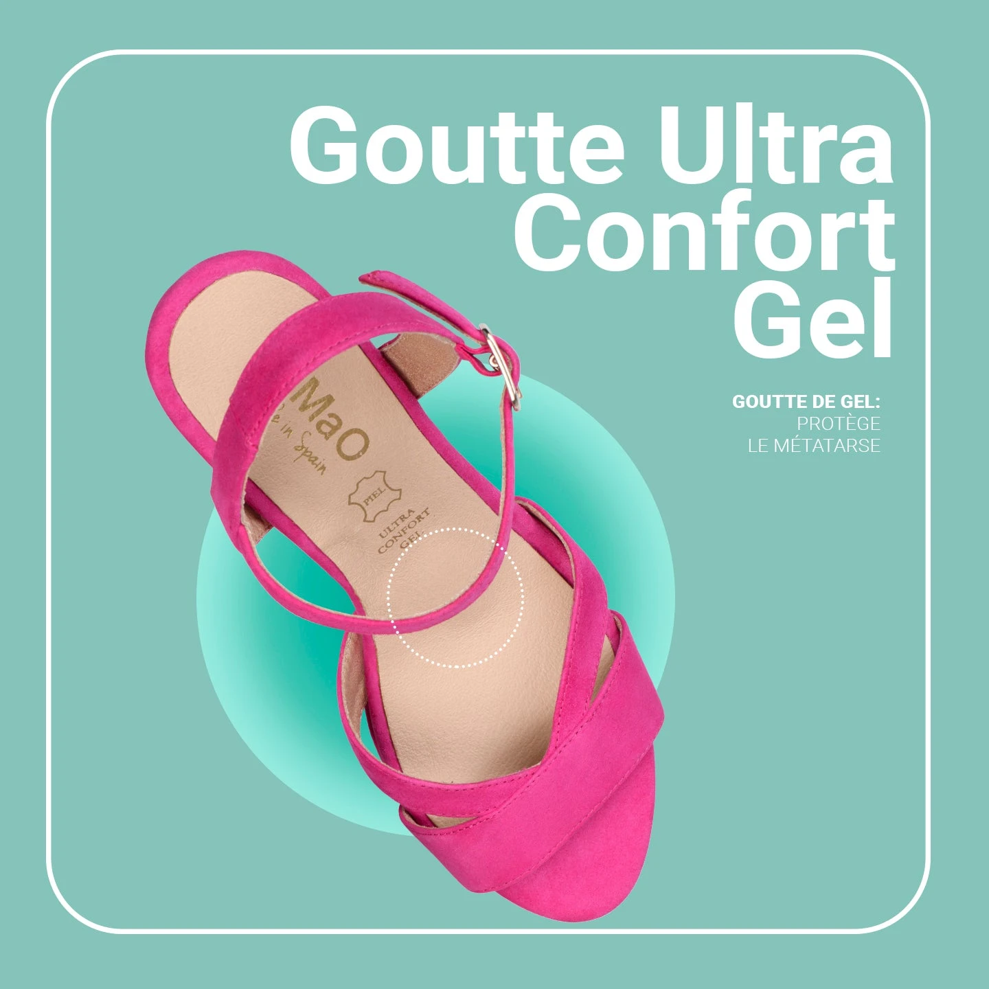 Elles sont dotées d’une semelle intérieure extra matelassée qui, associée à la technologie Ultra Confort Gel avec Goutte, les rend très confortables à porter pendant des heures. Les brides du cou-de-pied sont souples et ne provoquent pas de frottements. De plus, elles cachent les hallux valgus et comme elles sont lisses, elles ne font pas mal. Leur boucle vous permet de les ajuster à votre cheville et d’éviter que votre pied glisse.