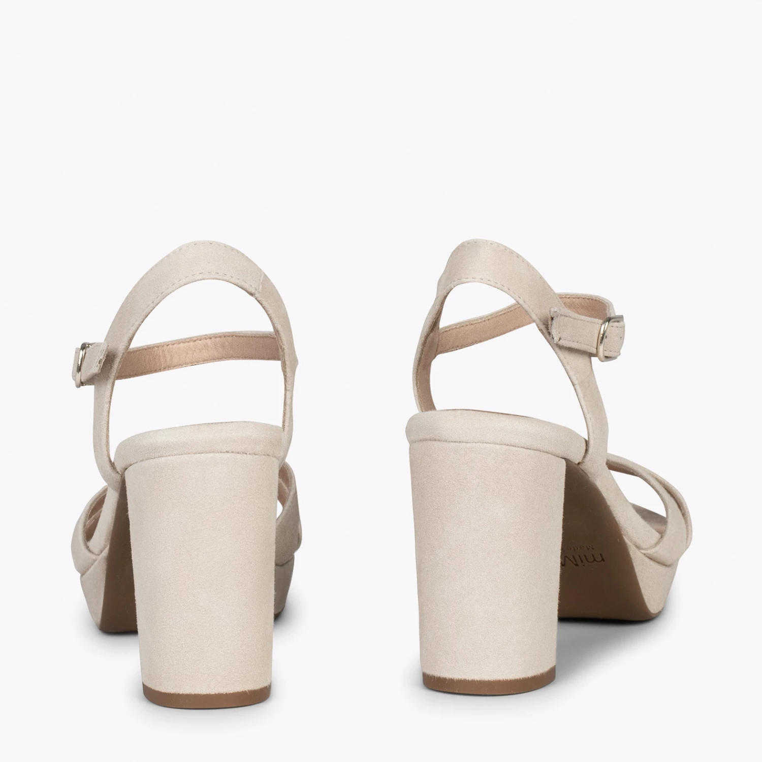 Le talon mesure 8 cm et il est très large, offrant ainsi une très bonne stabilité. Grâce à la plateforme, la hauteur du talon est compensée et le pied n’est pas trop incliné, ce qui augmente le confort. Semelle antidérapante et personnalisée miMaO.