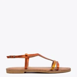 SANDALE PLATE À LANIÈRES MÉTALLISÉES COULEUR CAMEL. SANDALE CONFORTABLE EN CUIR ET AVEC SEMELLE INTÉRIEURE CONFORT GEL. COMMANDEZ VOS CHAUSSURES CONFORTABLES EN LIGNE ET RECEVEZ-LES SOUS 2 À 4 JOURS OUVRABLES. COMMANDEZ VOS CHAUSSURES EN LIGNE ET COMBINEZ MODE ET CONFORT.