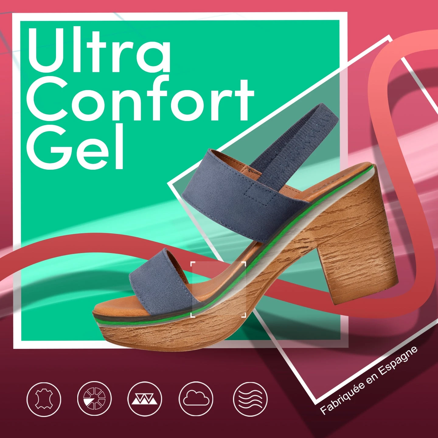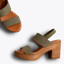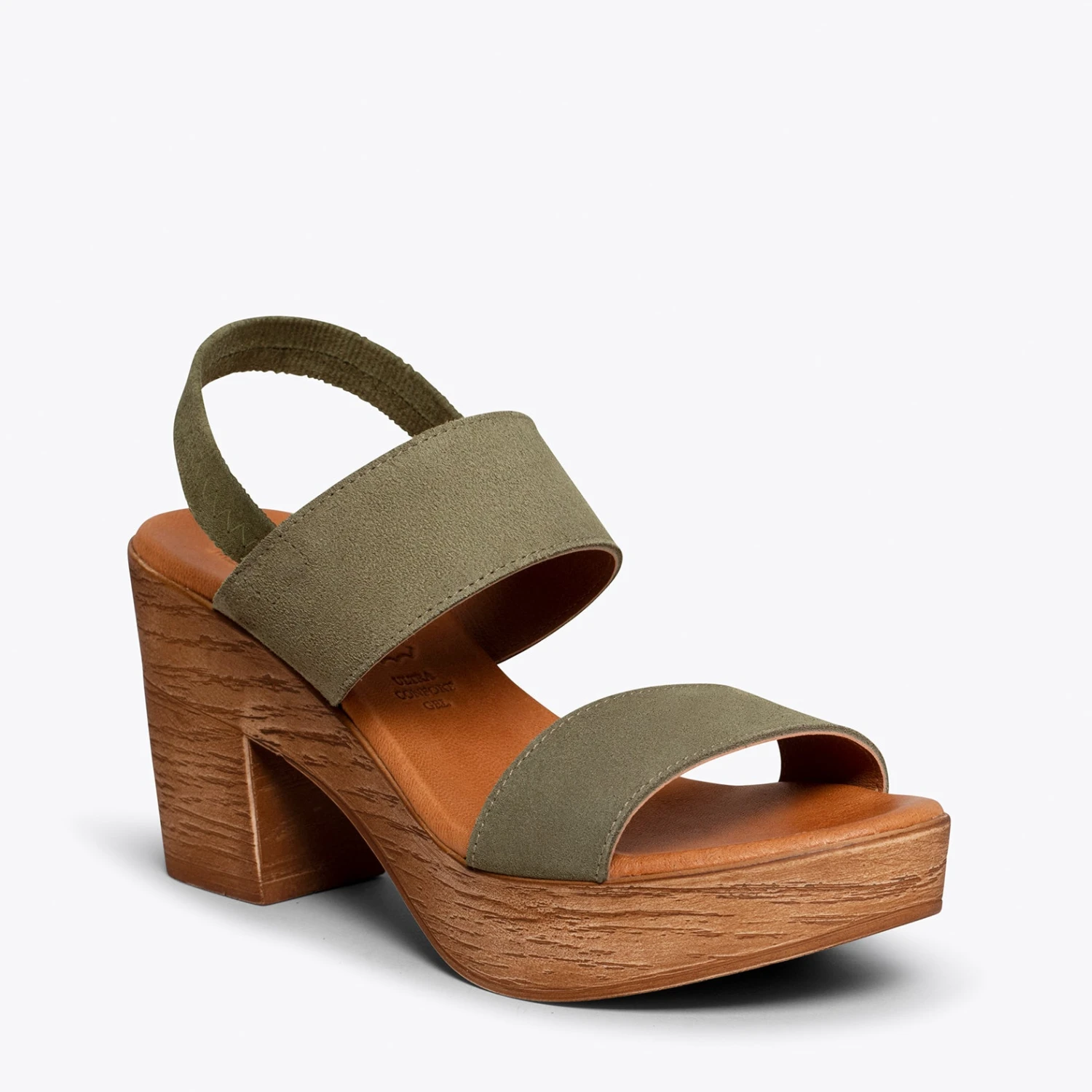 Nouvelles sandales plateforme KAKI avec brides Ă l’avant et Ă©lastique de maintien Ă la cheville Sandales tendance printemps-Ă©tĂ© 2021. Ces sandales Ă talon haut sont en cuir nubuck et intègrent Ă©galement la semelle intĂ©rieure en cuir Ultra Confort Gel pour un confort maximum pour vos pieds.