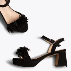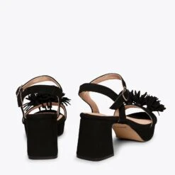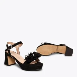 Si vous cherchez une sandale habillée, nous vous présentons le modèle POMPON. Une sandale NOIR en daim printemps été 2021. Avec son talon large de 6,5 cm et ses franges sophistiquées sur la bride à l’avant, vous attirerez tous les regards. Ce sont des sandales à talon haut confortables, car grâce à la plateforme de 2 cm et à notre technologie de confort, la semelle intérieure en cuir Goutte Ultra Confort Gel, votre pied sera reposé pendant des heures.