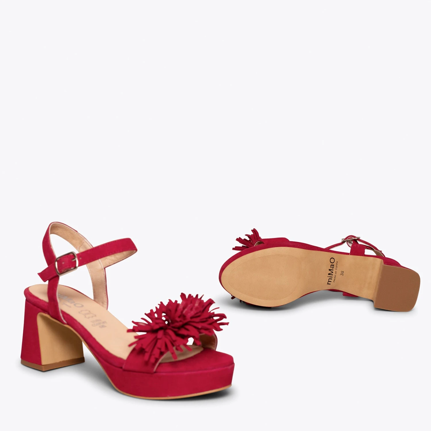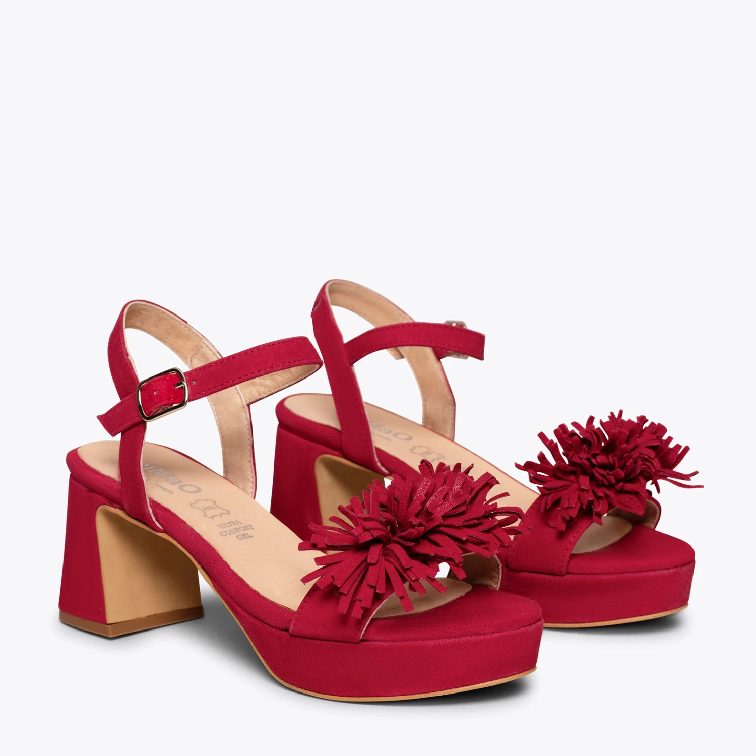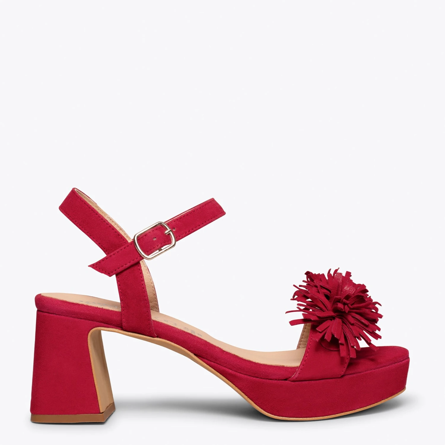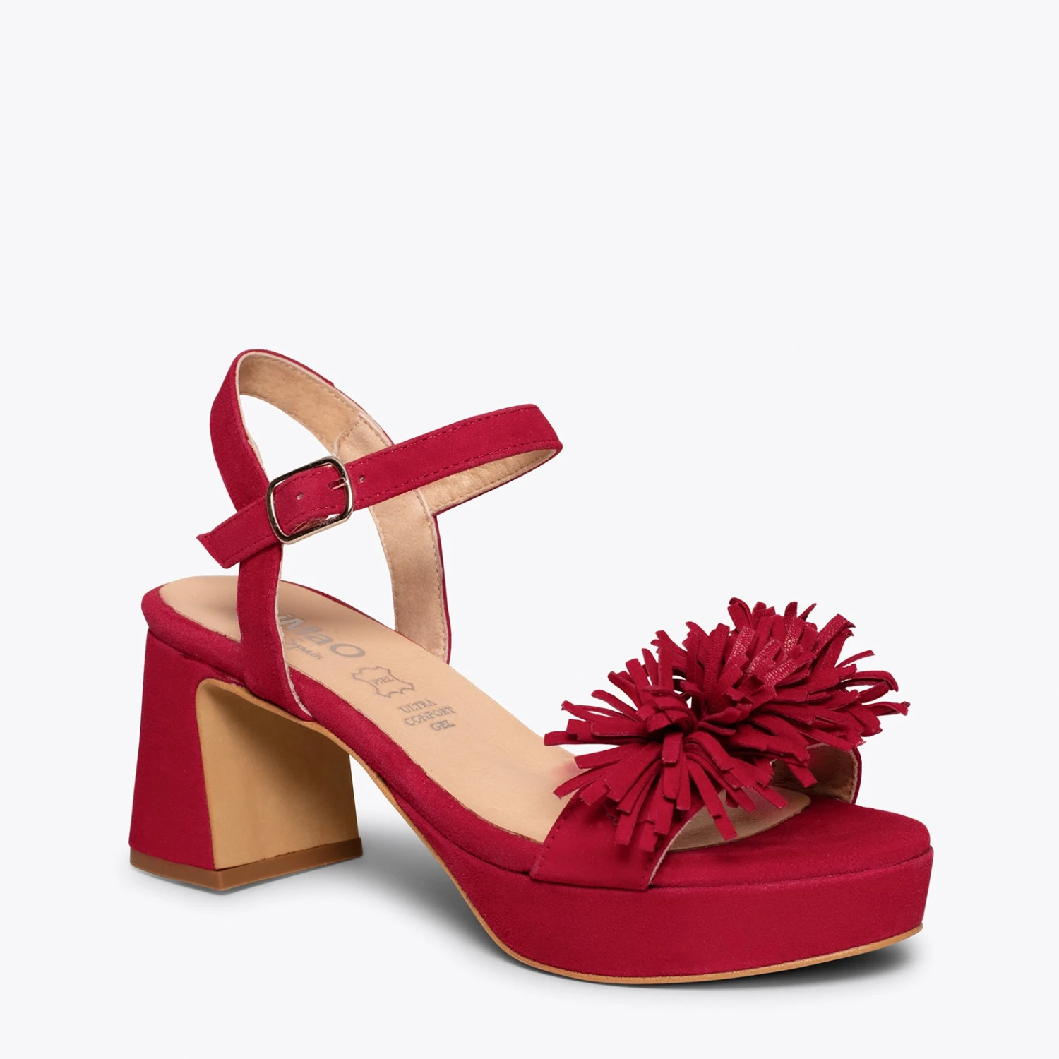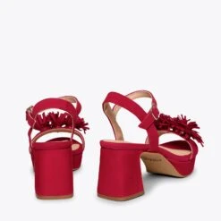 Si vous cherchez une sandale habillée, nous vous présentons le modèle POMPON. Une sandale ROUGE en daim printemps été 2021. Avec son talon large de 6,5 cm et ses franges sophistiquées sur la bride à l’avant, vous attirerez tous les regards. Ce sont des sandales à talon haut confortables, car grâce à la plateforme de 2 cm et à notre technologie de confort, la semelle intérieure en cuir Goutte Ultra Confort Gel, votre pied sera reposé pendant des heures.