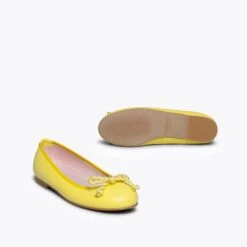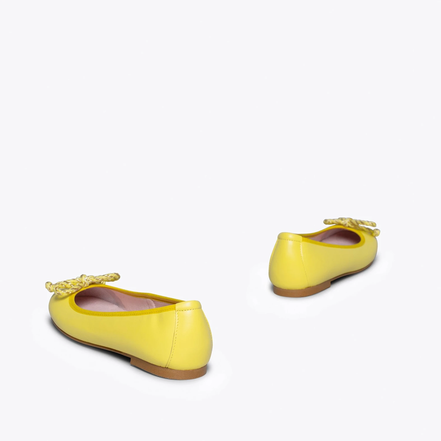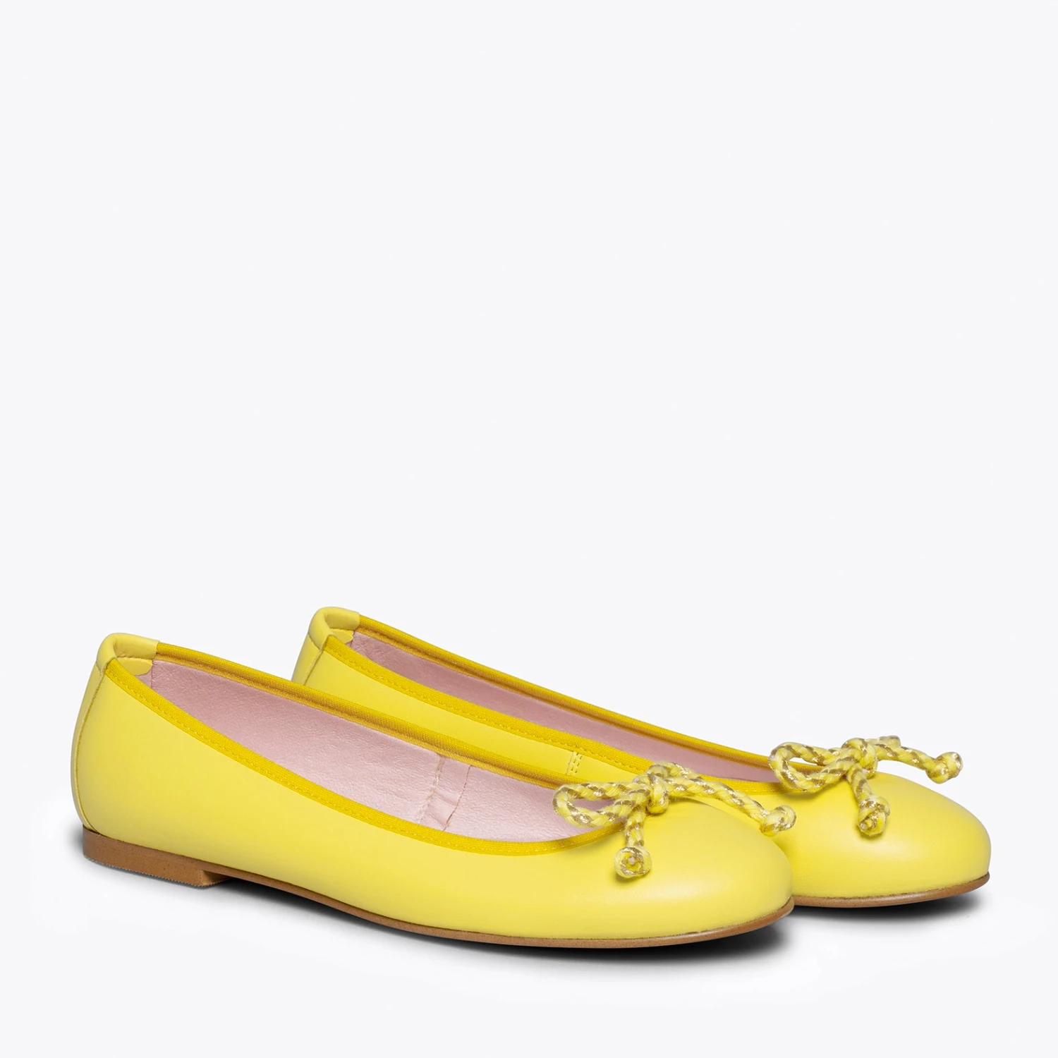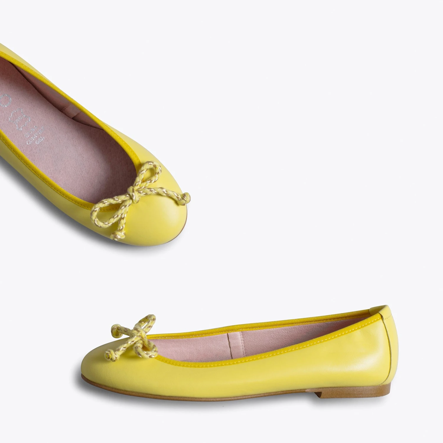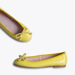 Ballerine JAUNE pour femme à lacets décoratifs dorés sur le dessus. Cette ballerine en cuir lisse a un bout arrondi et un mini talon de 1 cm. Elle sera votre chaussure JAUNE idéale pour le quotidien grâce au confort de la semelle intérieure en cuir Ultra Confort Gel et de sa souplesse. Ballerine parfaite pour aller au travail ou pour vos loisirs. Cette ballerine plate JAUNE est disponible en plusieurs coloris tendance cette saison printemps – été 2020. Choisissez la vôtre!