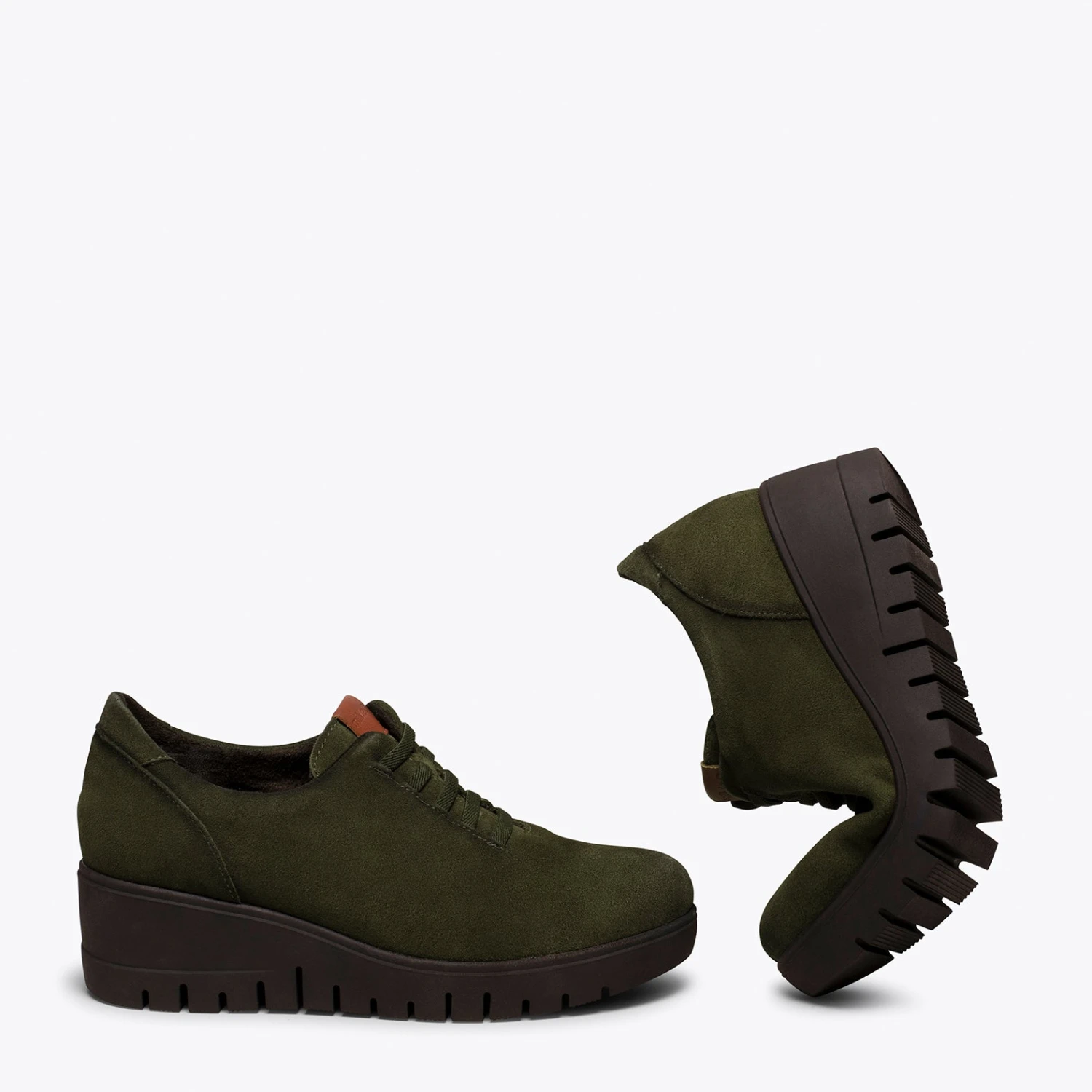 Si vous ĂŞtes amoureuse des chaussures de sport et des compensĂ©es, vous allez adorer ce blucher KAKI. C’est la combinaison parfaite de confort et de polyvalence. Grâce Ă la technologie de sa semelle intĂ©rieure memory absorber foam, vous aurez la sensation qu’elle est faite sur mesure. De plus, grâce Ă la flexibilitĂ© de sa semelle extĂ©rieure, vous pouvez vous dĂ©placer librement et confortablement. Lorsque vous aurez essayez cette chaussure en cuir hydrofuge, vous ne voudrez plus l’enlever.