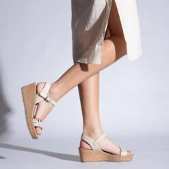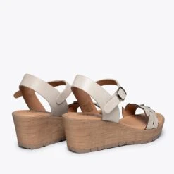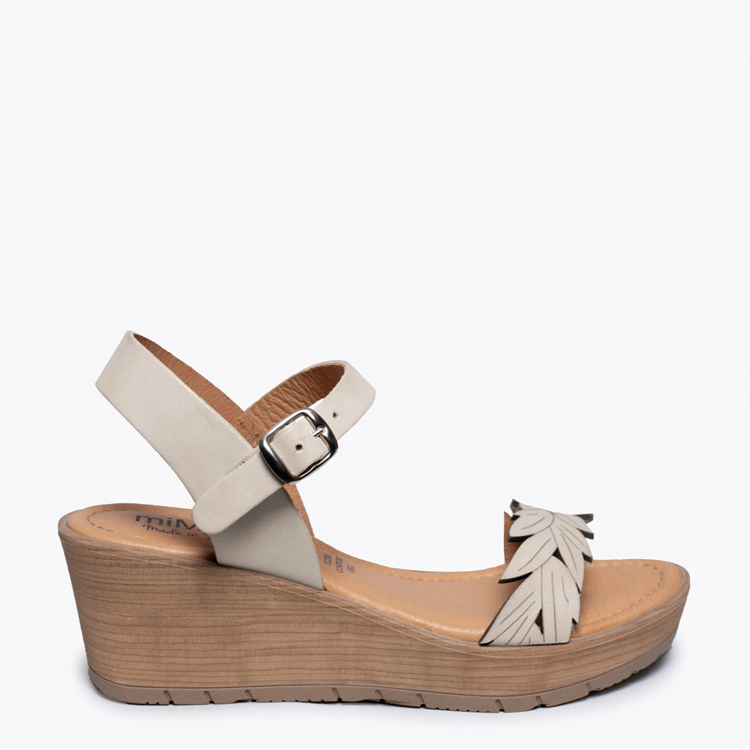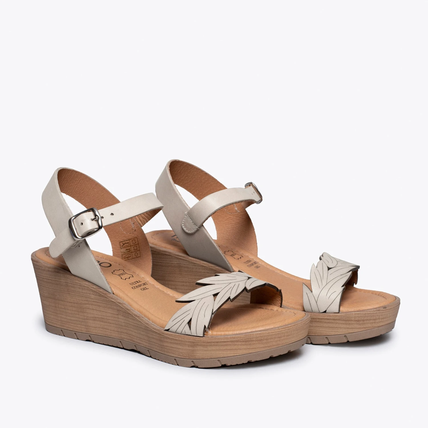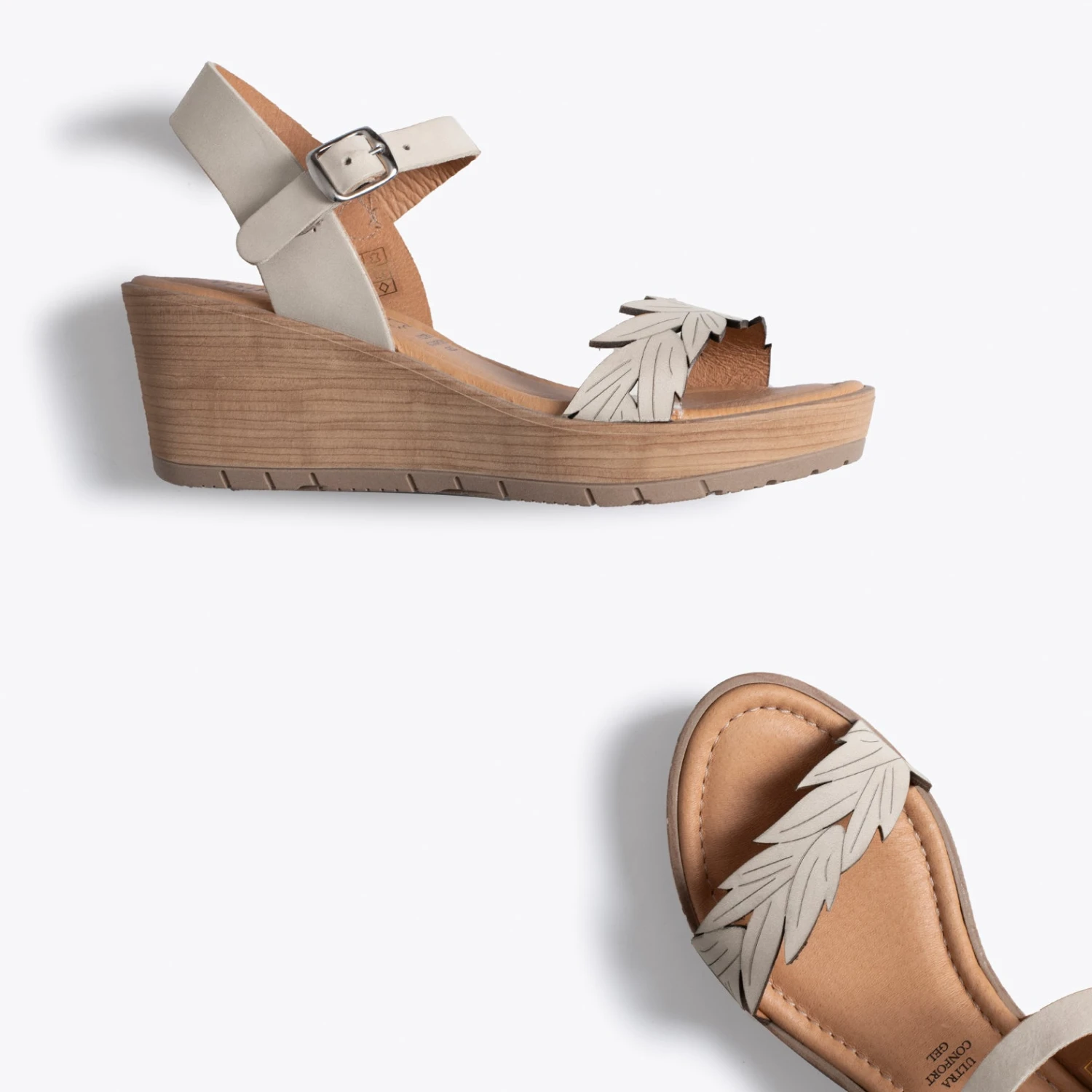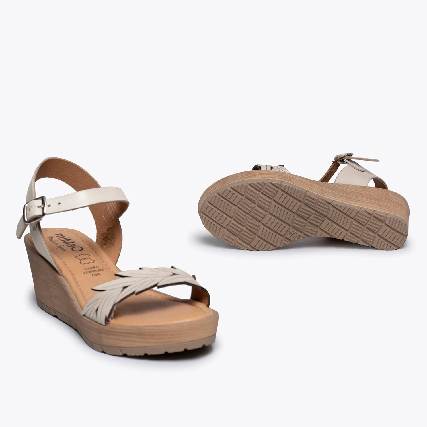 Cet été, choisissez les compensées imitation bois BLANC CASSÉ avec une jolie bande en forme de feuilles. Une chaussure compensée en cuir avec une hauteur moyenne de 6,5 cm et une plateforme avant de 2,5 cm. Design d’ une chaussure confortable, car grâce à la technologie d’une semelle intérieure Confort Gel, vous pouvez marcher toute la journée sans douleur.