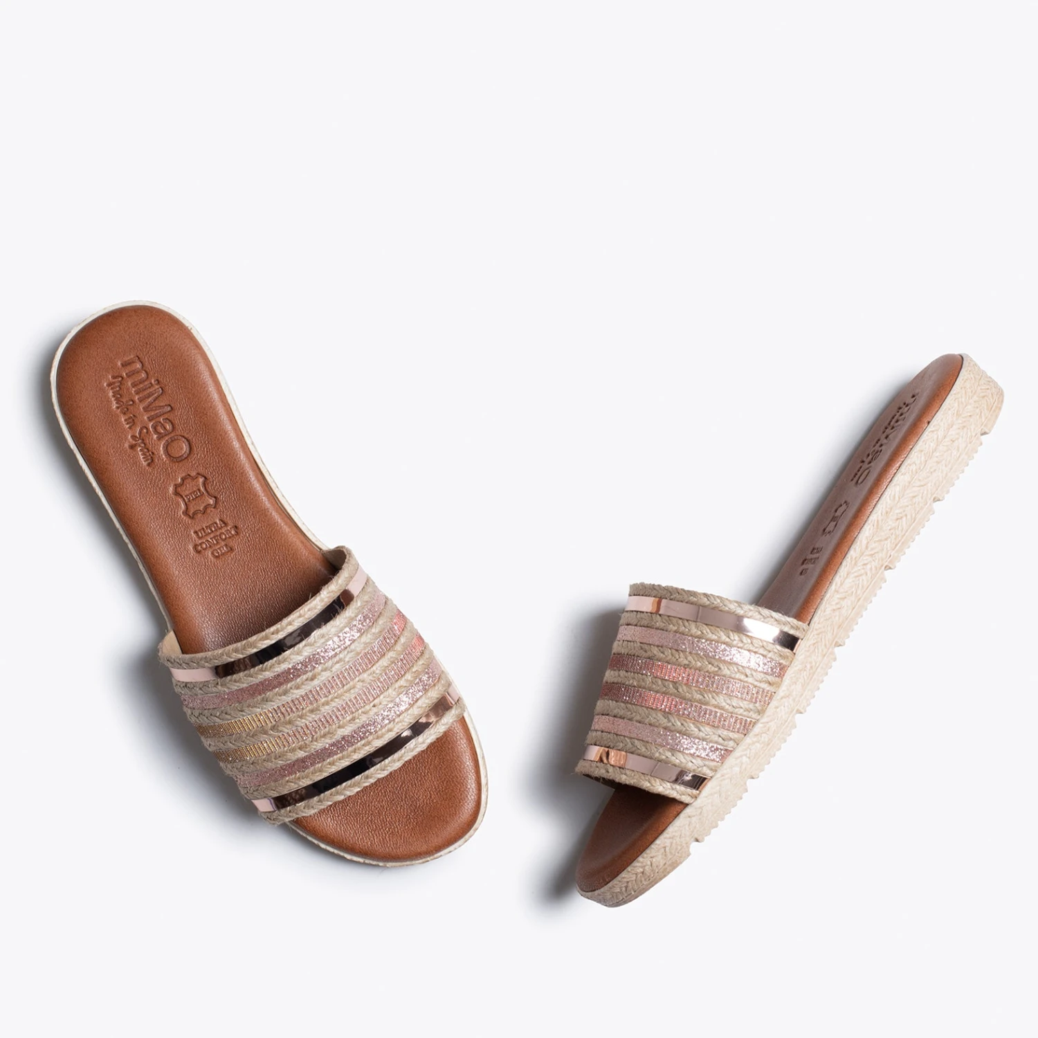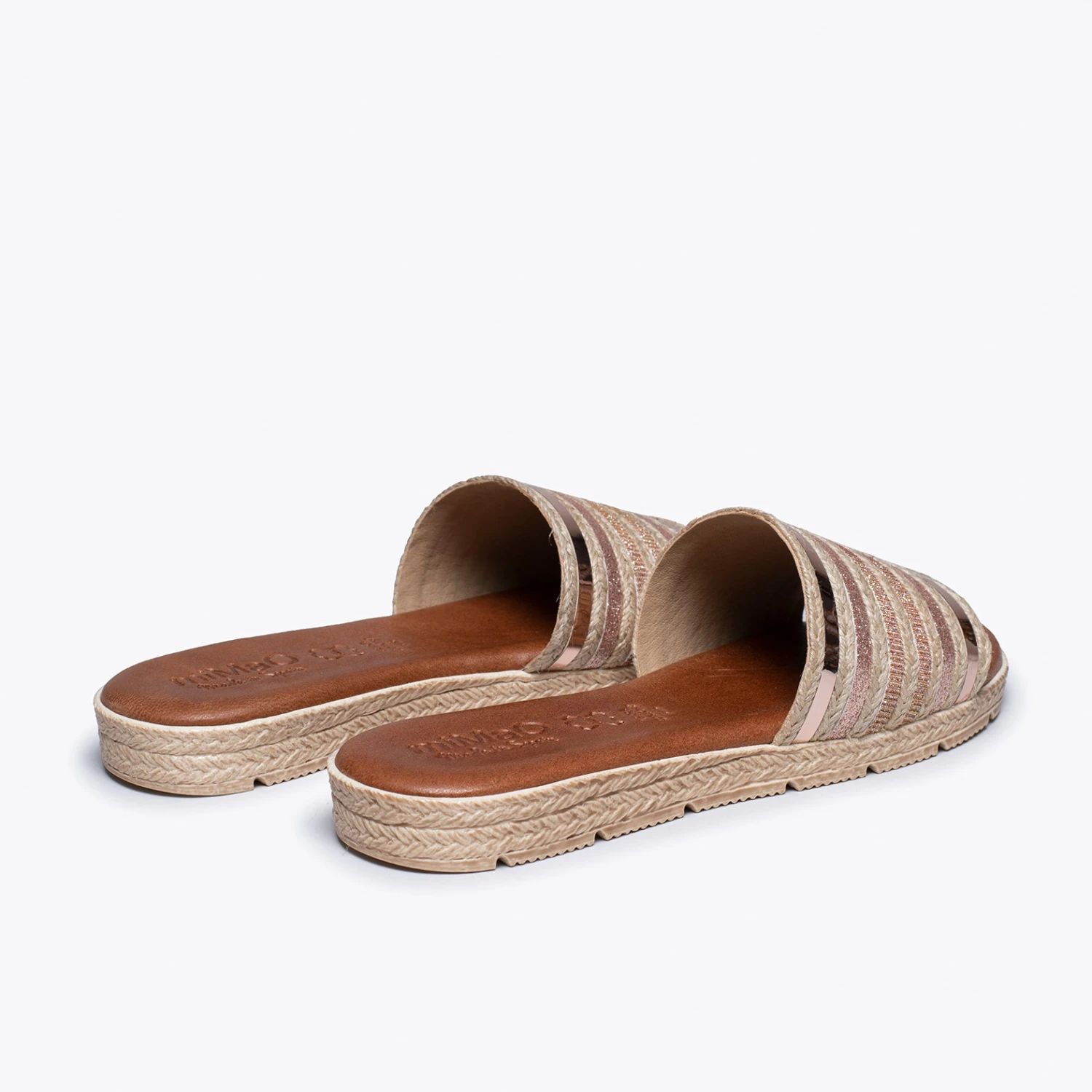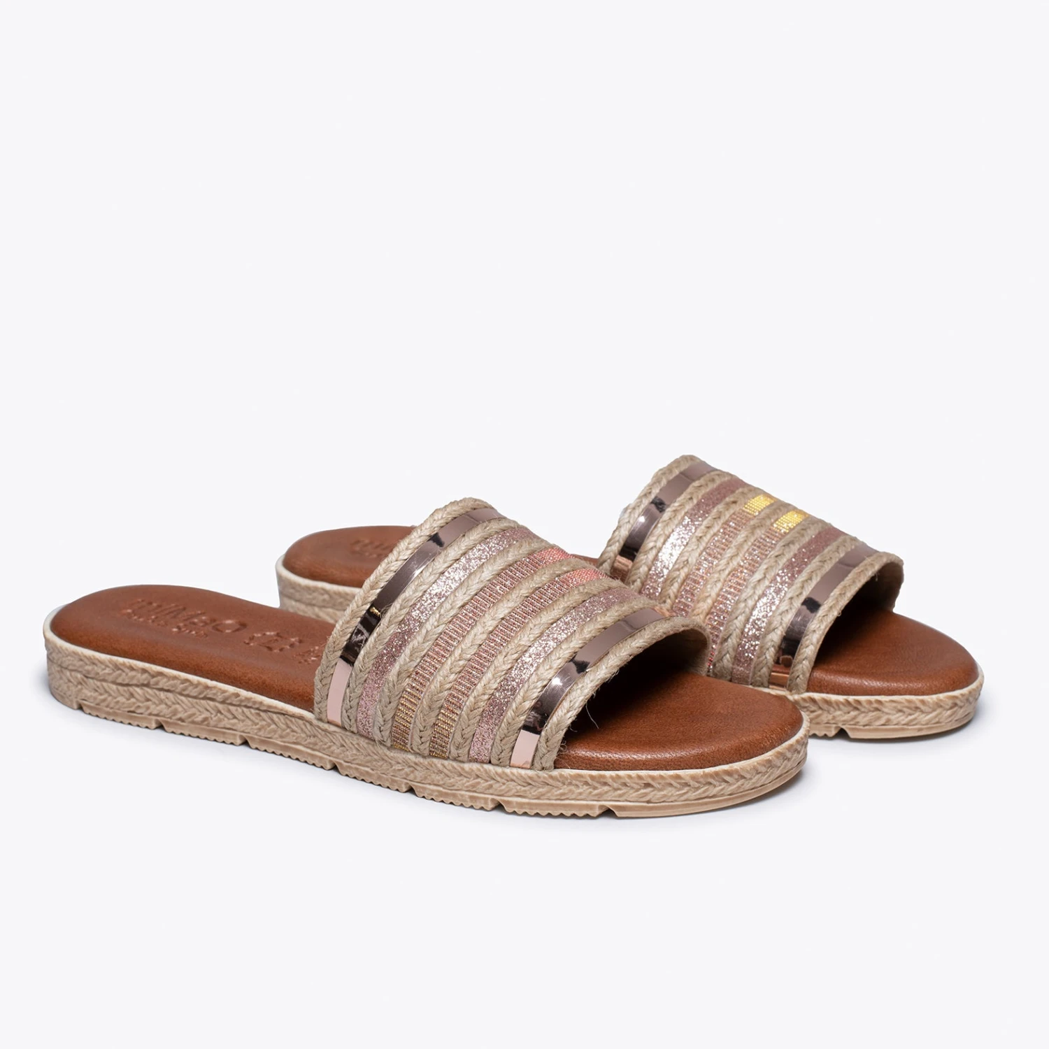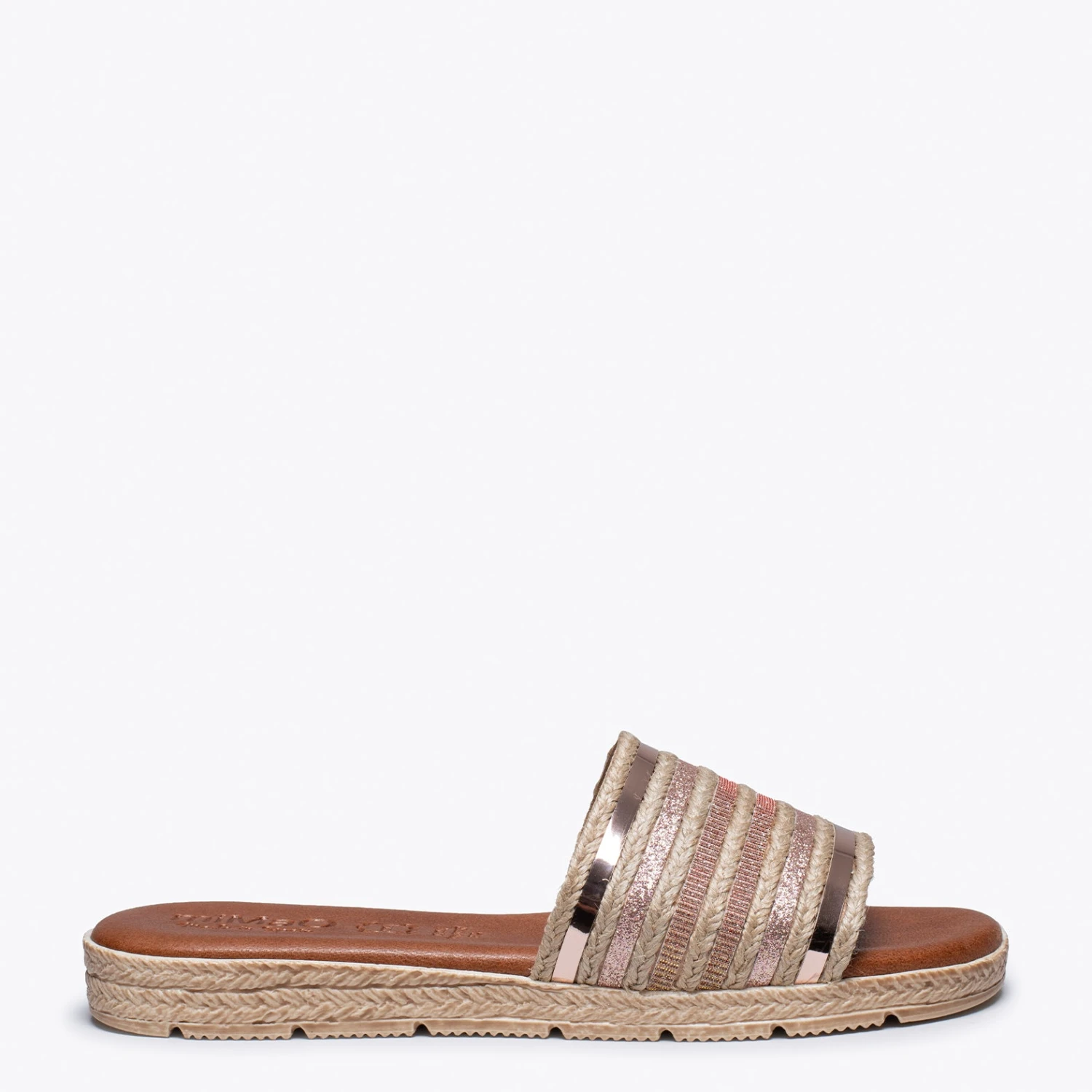 Sandales plates ROSÉ type Tong parfaites pour cette saison estivale 2020. La sangle à l’avant de cette sandale ROSÉ est composée de petites lignes pailletées et des tresses espadrille, par conséquent son design est très original. De plus, cette sangle permet un maintien parfait du pied, vous pourrez donc marcher pendant des heures en toute sécurité.