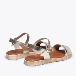 La bande à l’avant est composée de petites tresses en jute combinées à des lanières glitter DORÉ, le design ne passera pas inaperçu. C’est la chaussure plate idéale pour femme pour les journées et soirées de cet été. La sangle qui se ferme avec une boucle à la cheville, en cuir nappa métallisé, offrira un ajustement parfait.