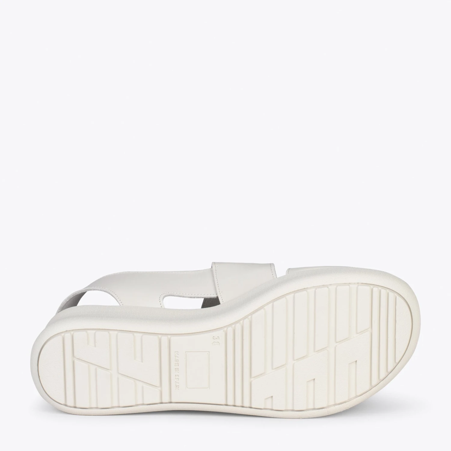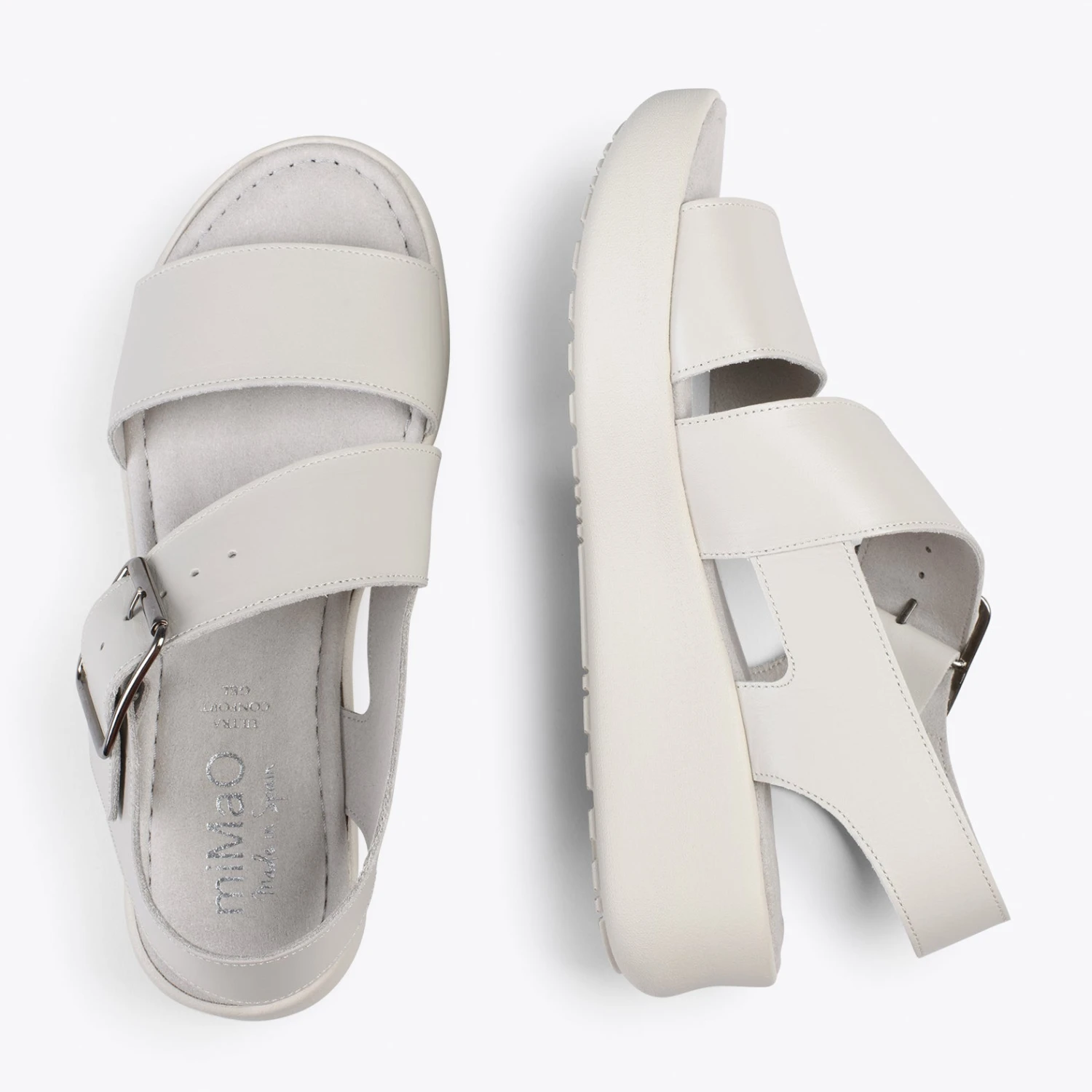 Nous pouvons voir comment la coupe Ă l’avant, rĂ©vèle les pieds, tandis que dans la partie arrière, nous voyons une sangle Ă©paisse avec une boucle. Cette boucle possède 5 trous, avec lesquels elle pourra s’ajuster parfaitement.
