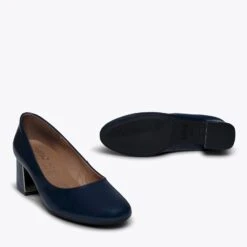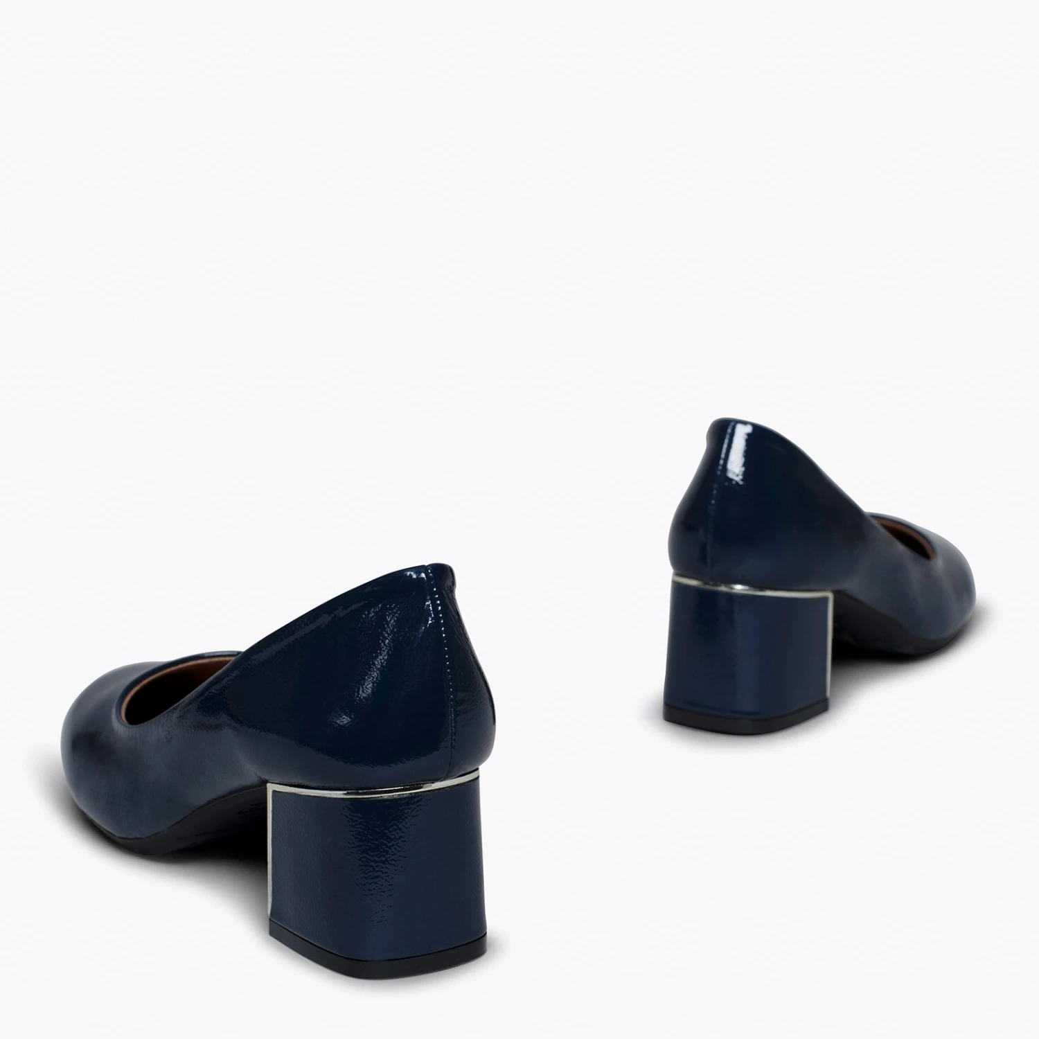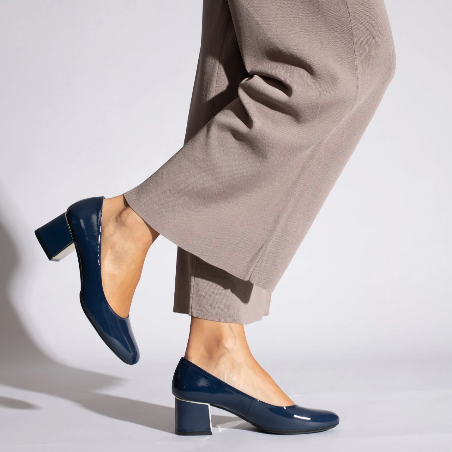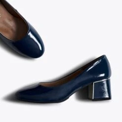 Chaussure en cuir verni BLEU MARINE avec bout arrondi et talon moyen de 5,5 cm de large. Une chaussure en cuir verni froissé avec un talon large et dorure élégante. Cet automne hiver 2020-21, choisissez la chaussure à talon la plus confortable, car toutes nos chaussures miMaO ont une semelle intérieure en cuir Goutte Ultra Confort Gel incorporée.
