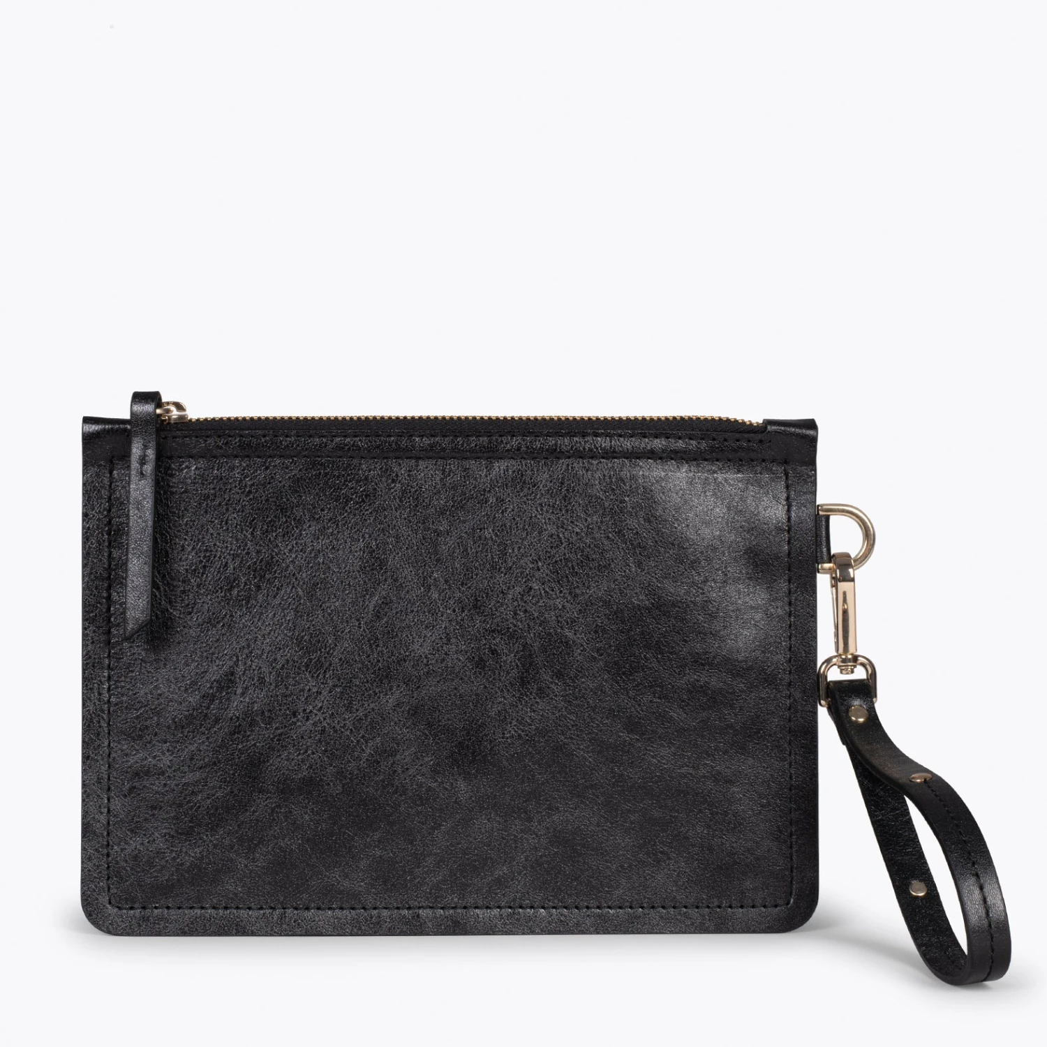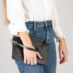 Cette pochette est dotée d’une fermeture éclair sur le dessus pour une ouverture facile. Vous pouvez la porter au poignet grâce à sa sangle, qui peut également être retirée si vous le préférez.