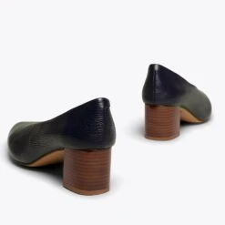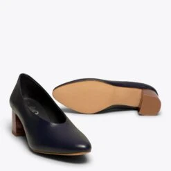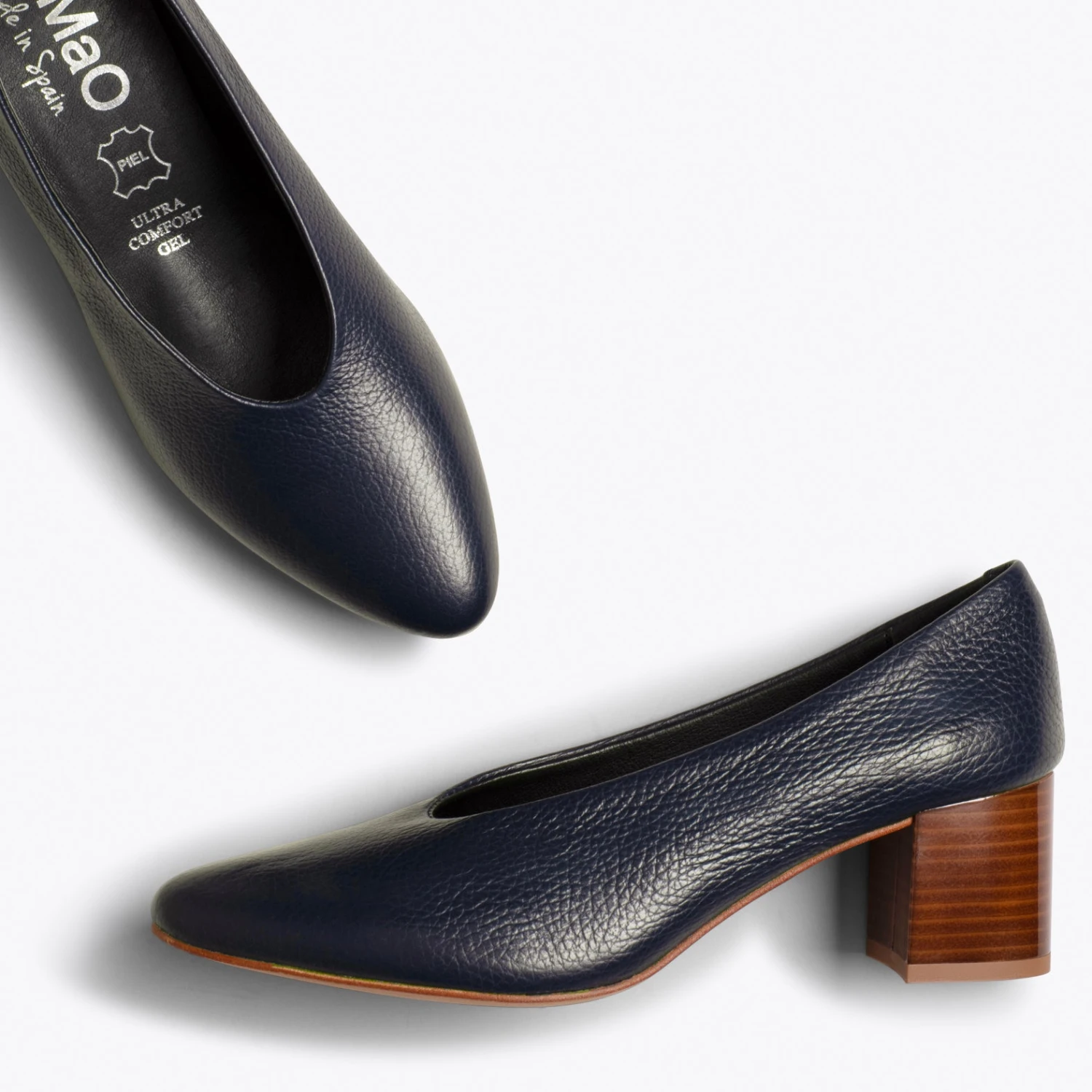 Chaussures à talon en bois avec une découpe en V BLEU MARINE. Chaussures 100% cuir et fabriquées en Espagne. Des talons BLEU MARINE parfaits pour tous vos outfits. Avec leur semelle intérieure de goutte ultra confort gel qui prend soin de votre dos et de vos pieds pour qu’elles soient vos chaussures préférées et les plus confortables.