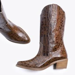 Les bottes Cowboy pour femme MARRON. Bottes en cuir MARRON avec imprimé crocodile. Cette botte possède un talon de 5 cm imitation bois qui donnera une touche plus authentique à vos bottes de Cowboy. Bottes pour femme avec tige de 28cm, une hauteur idéale pour combiner avec une jupe ou une robe vaporeuse.
