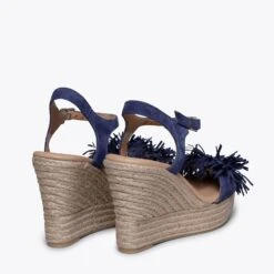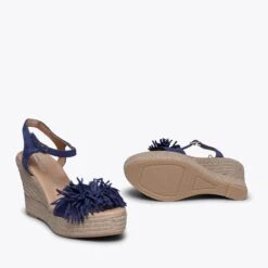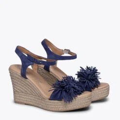Espadrillles à haut talon BLEU MARINE en daim avec des ornements à pompons sur le devant. Ces sandales pour femme ont un semelle compensée de 10 cm et une plate forme de 3 cm qui en feront vos sandales les plus confortables pour la saison 2020. Des sandales à talon haut, confortables avec une semelle en cuir Goutte Ultra Confort Gel incorporée. Vos sandales miMaO seront vos chaussures préferées pour le printemps /été 2020 .Si vous cherchez des espadrilles élégantes sur nore site miMaO vous trouverez un large choix de modèles. Essayez la qualité de chaussures en cuir fabriquées en Espagne.